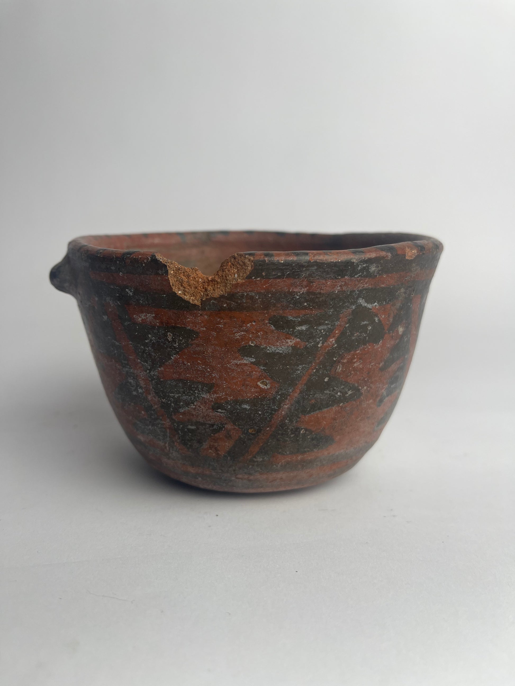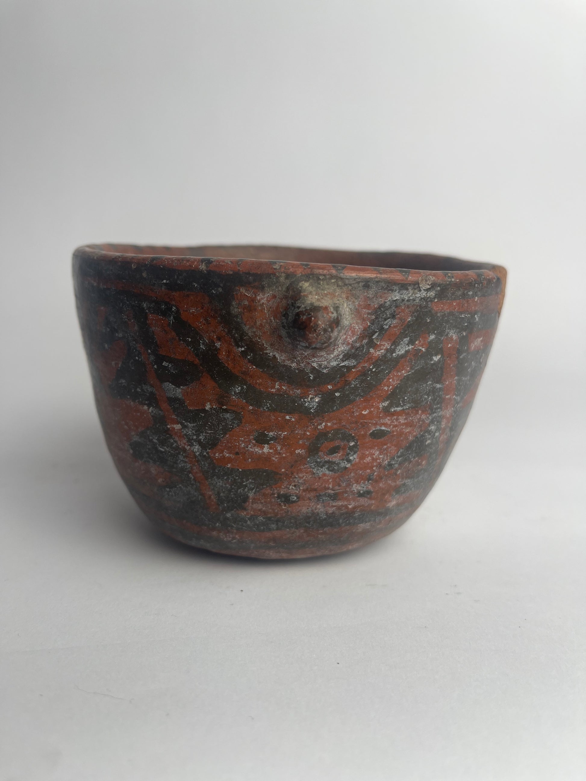 This Nariño bowl, dating between 500–1500 CE, is a fine example of the painted ceramic tradition of the Andean region of southern Colombia and northern Ecuador. The vessel has a rounded body and has a small point on one side.