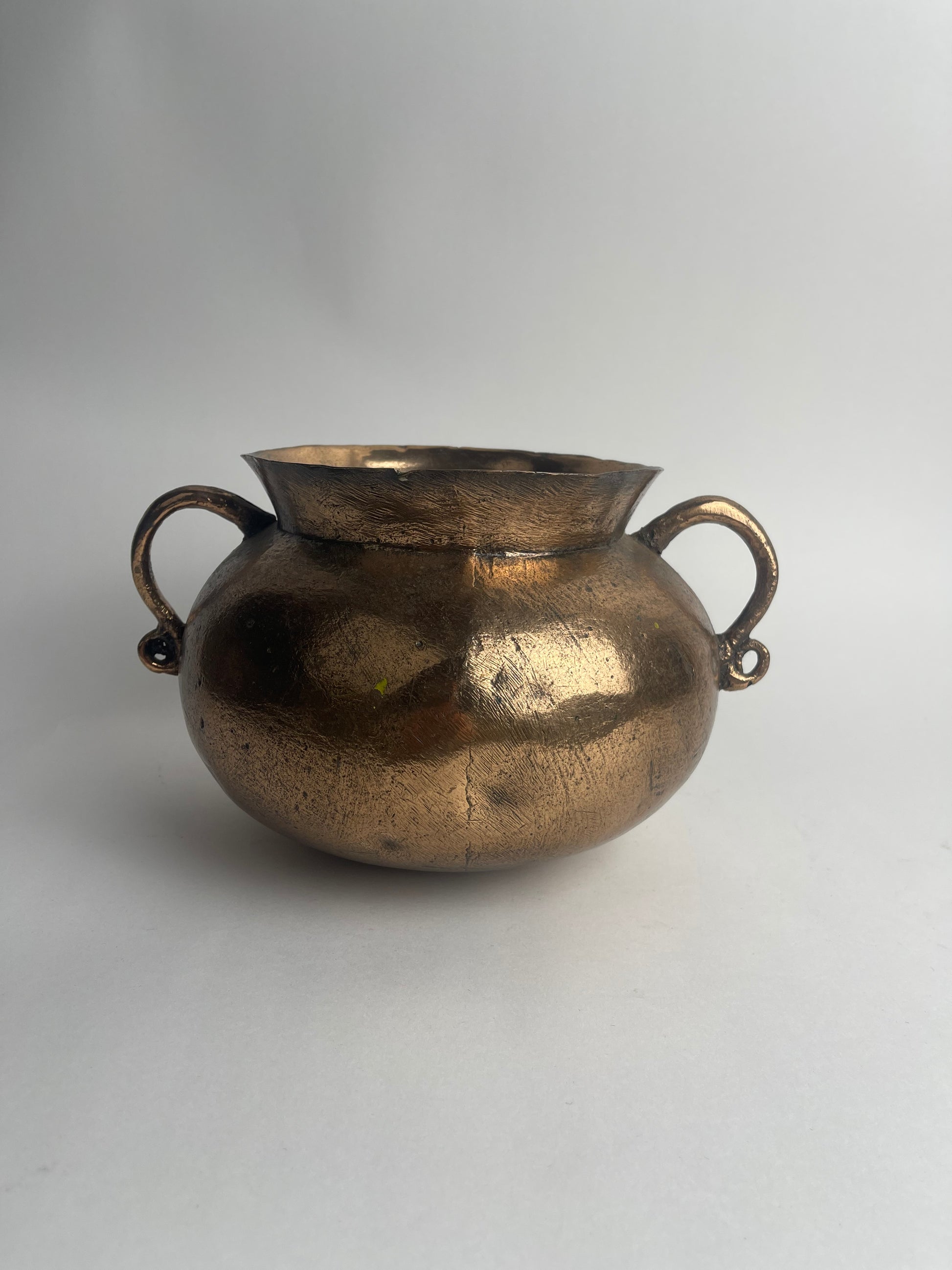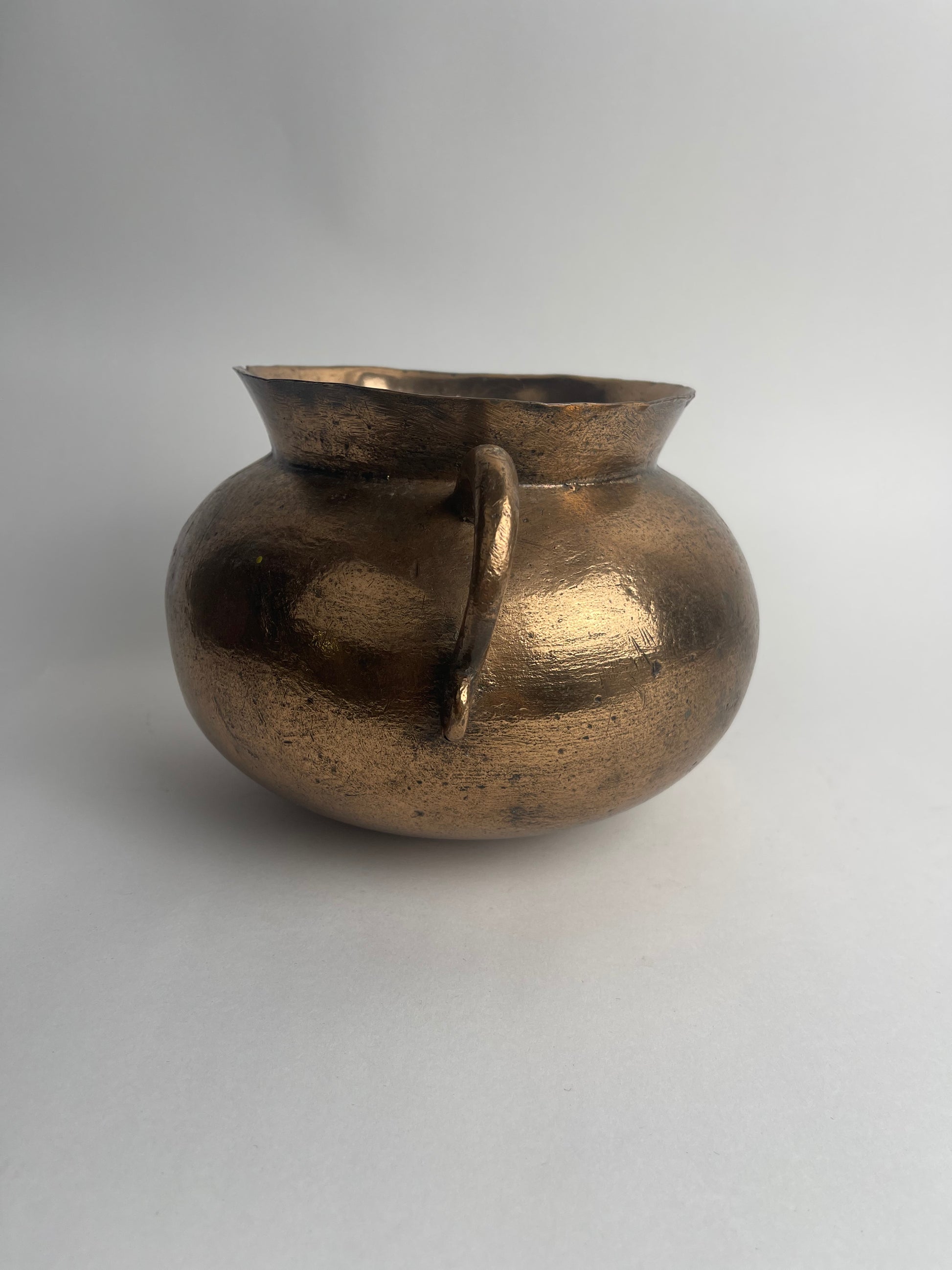 Bronze Grape cooking pot with carved initial "N" on the flared rim. Has been cleaned. Cast in Two Parts with a seam running down the middle of the vessel.