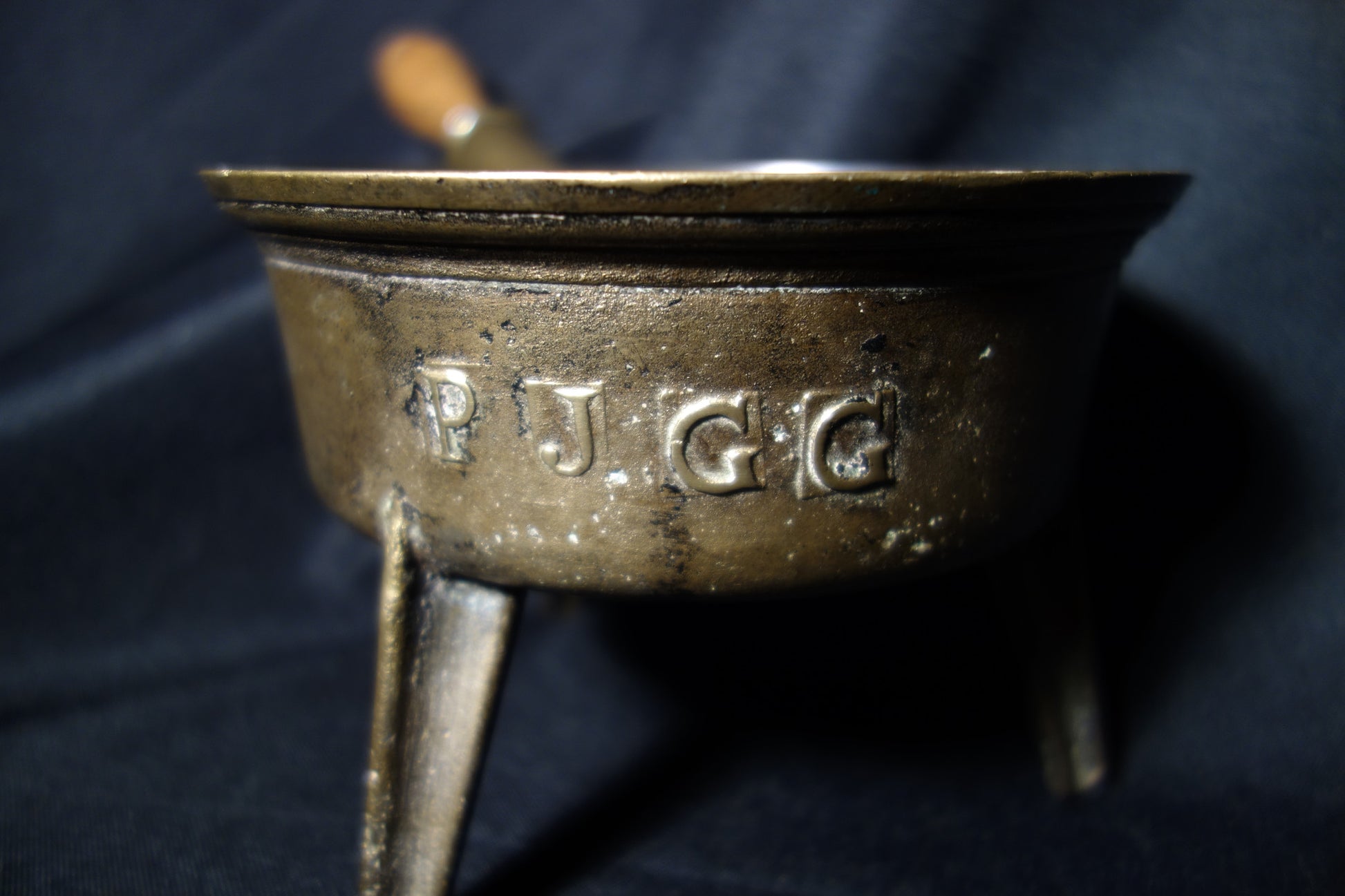 A small bronze posnet pot marked PJ GG made in England with a wooden handle.