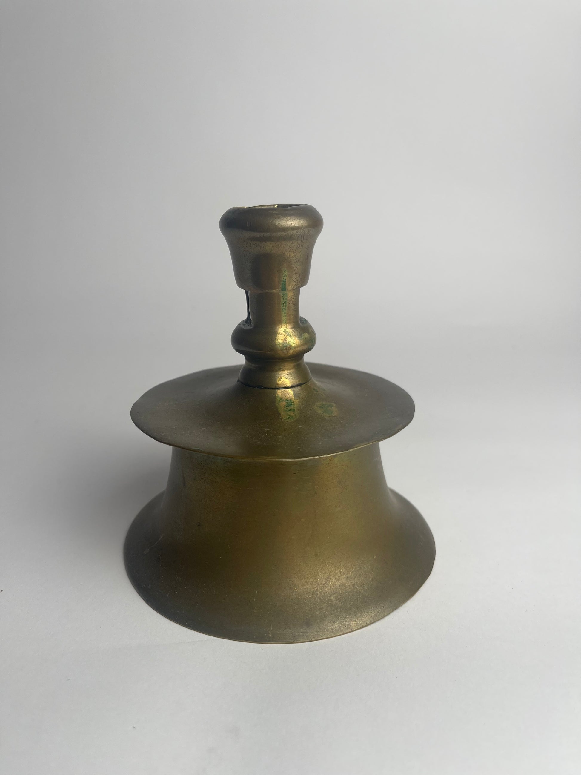 This capstan candlestick, dating to the 17th century, is a robust example of early continental brass lighting. Made with solid brass and joined between the base and socket, it features the characteristic capstan-shaped base, broad and stepped for stability, and a cut socket with a lateral opening that allowed spent candle stubs to be pushed out easily.
