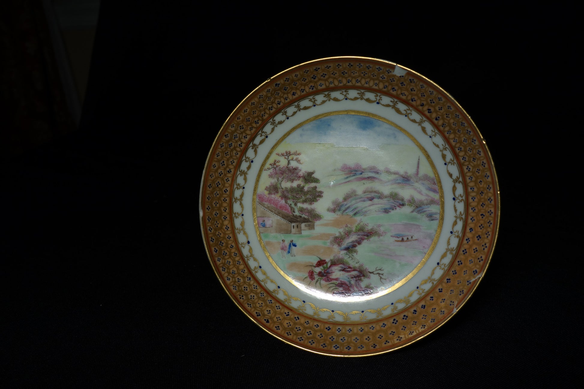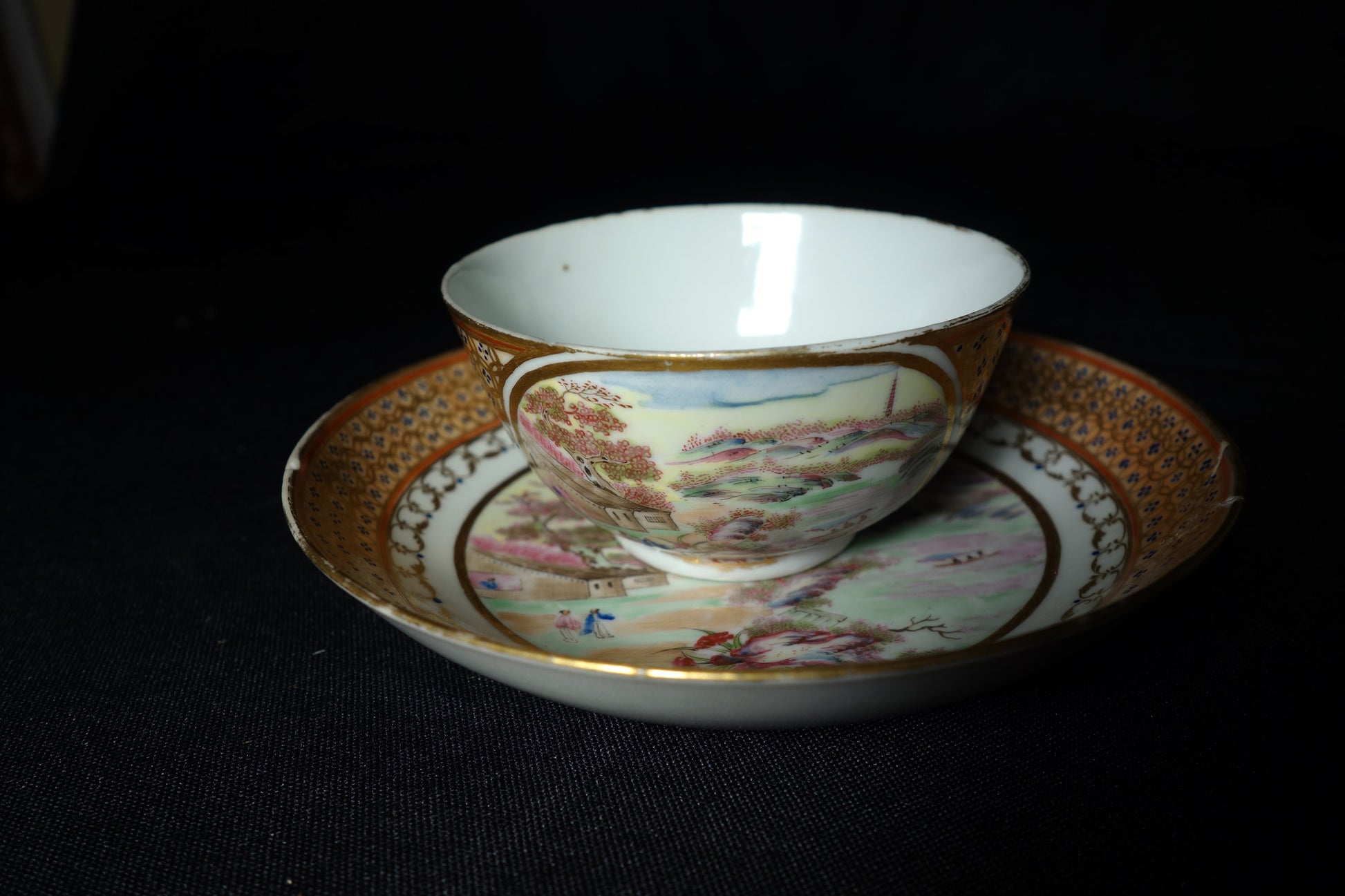 An amazing Chinese export tea bowl and saucer with breathtaking and large landscapes painted in vibrant colors with wonderful border decoration.