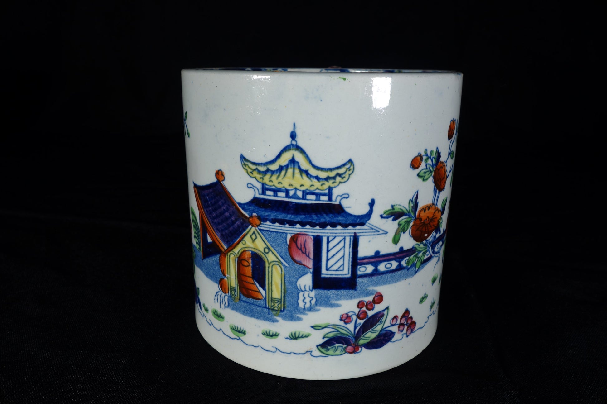 This wonderful Flip mug features beautiful chinoiserie decoration highlighted in colorful luster decoration. The mug is marked "Semi Porcelain" on the bottom. It was used to drink flip which is a mixed drink that incorporates eggs, beer, and cream.