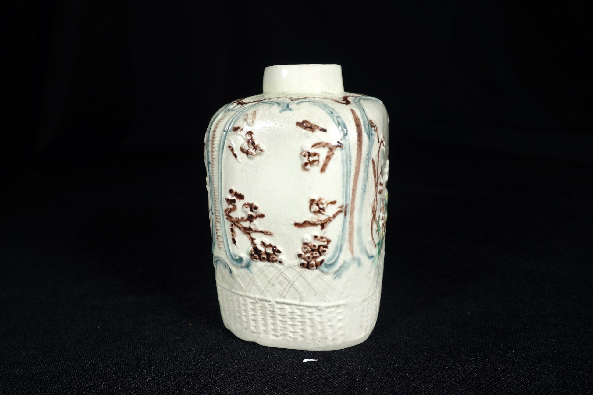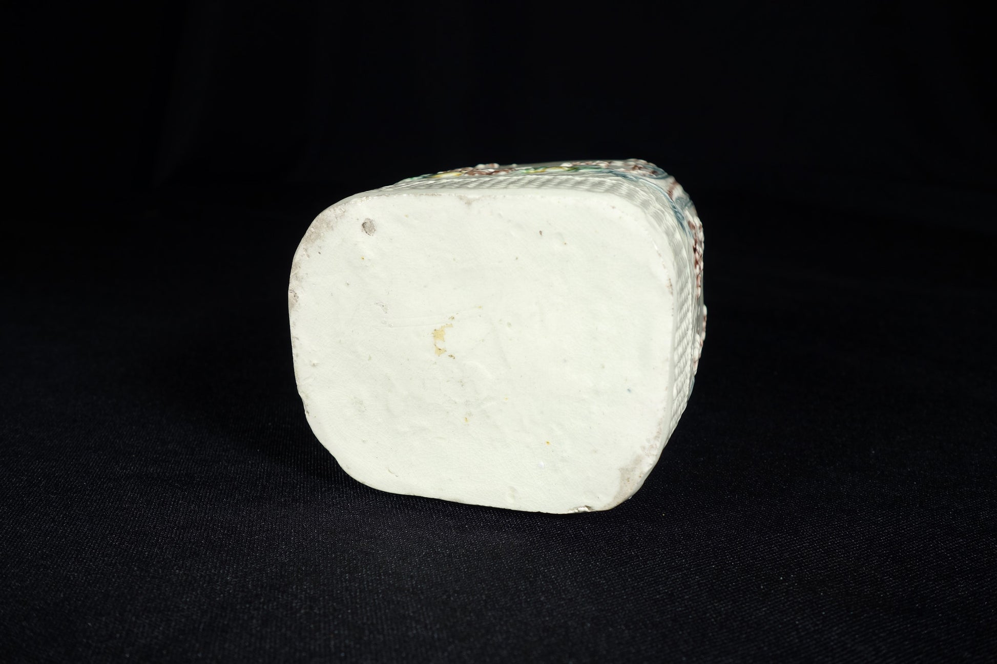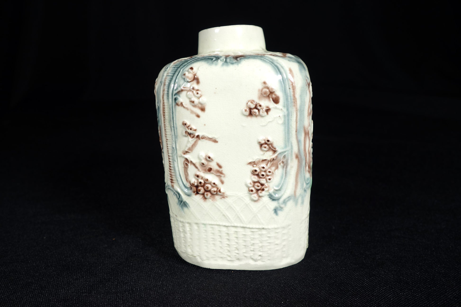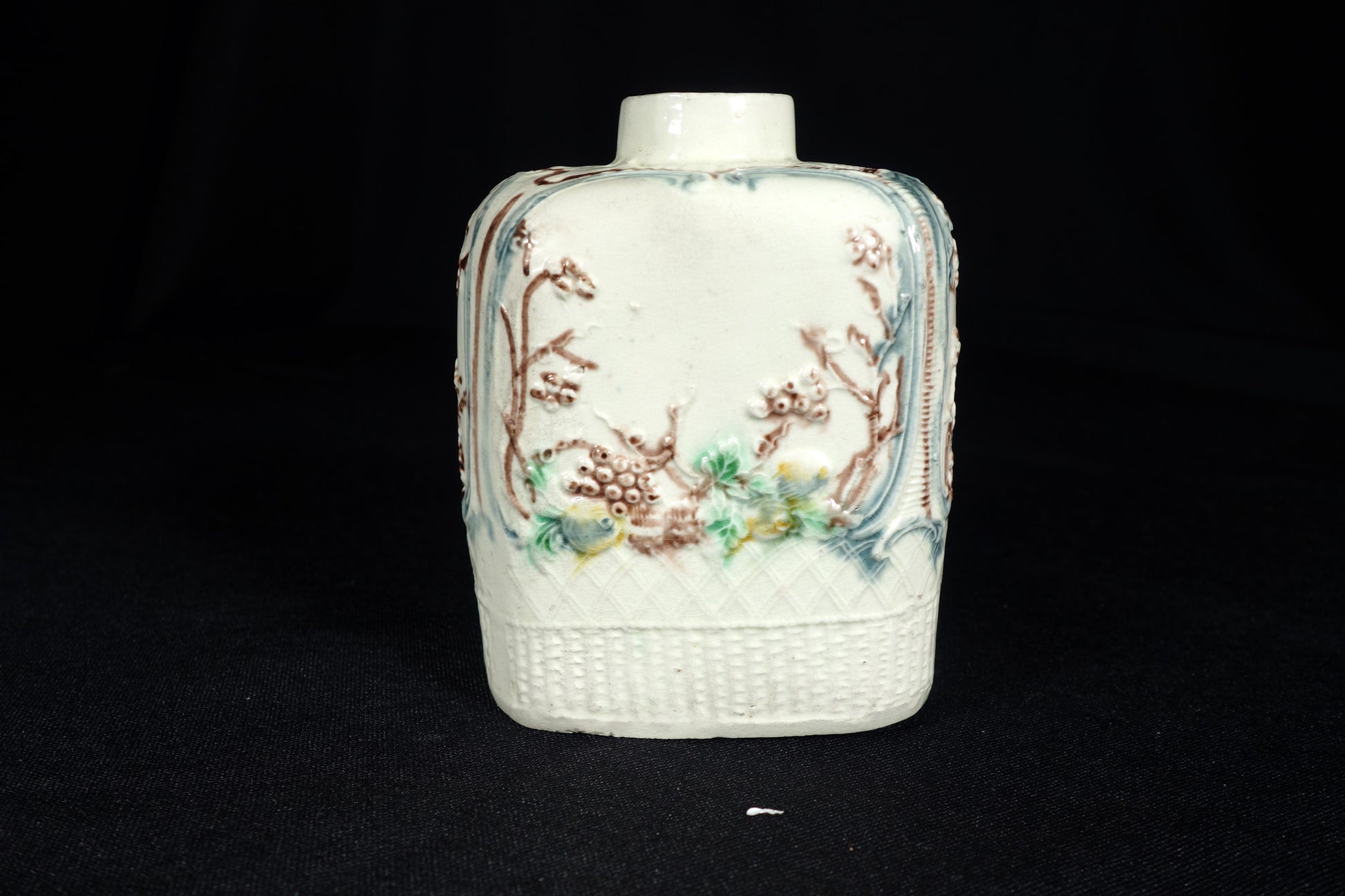 A very nice tea caddy made by William Greatbatch with a molded fruit basket decoration highlighted with green, yellow, grey, and brown enamels.