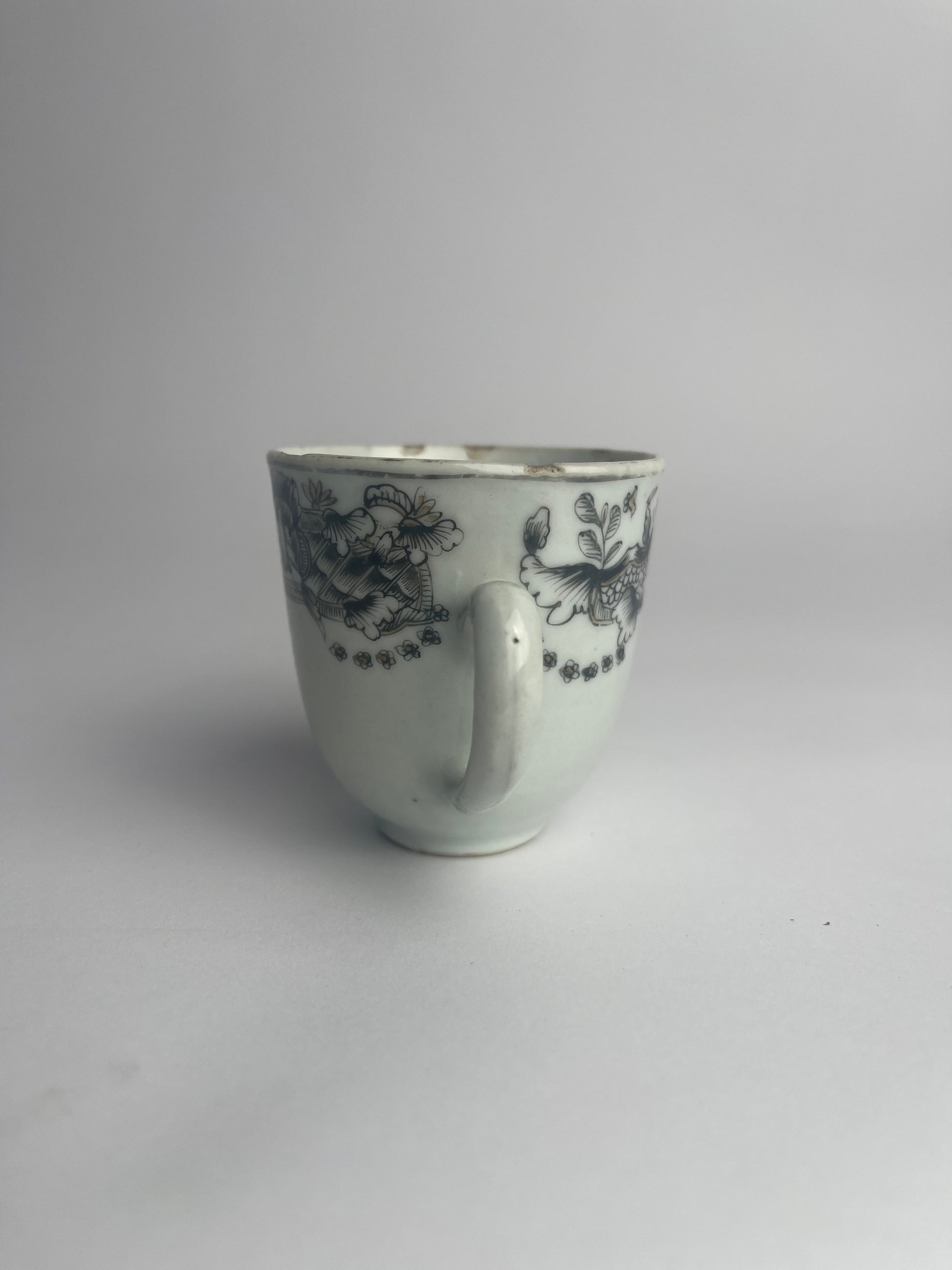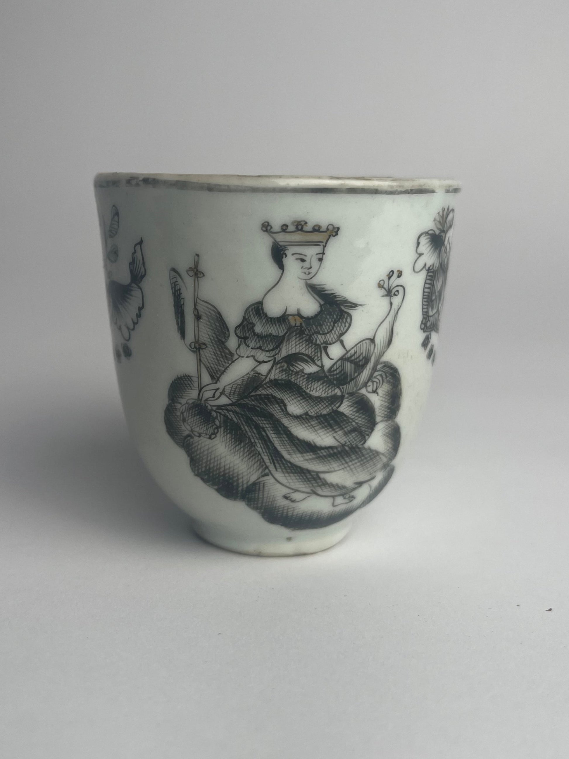 Porcelain cups of this type were made for the Western export market, appealing to the neoclassical taste for mythological themes and refined decoration. The use of grisaille (black and white enameling) with touches of gold reflects a popular 18th-century fashion that imitated the look of engraved prints, highly prized among European collectors.