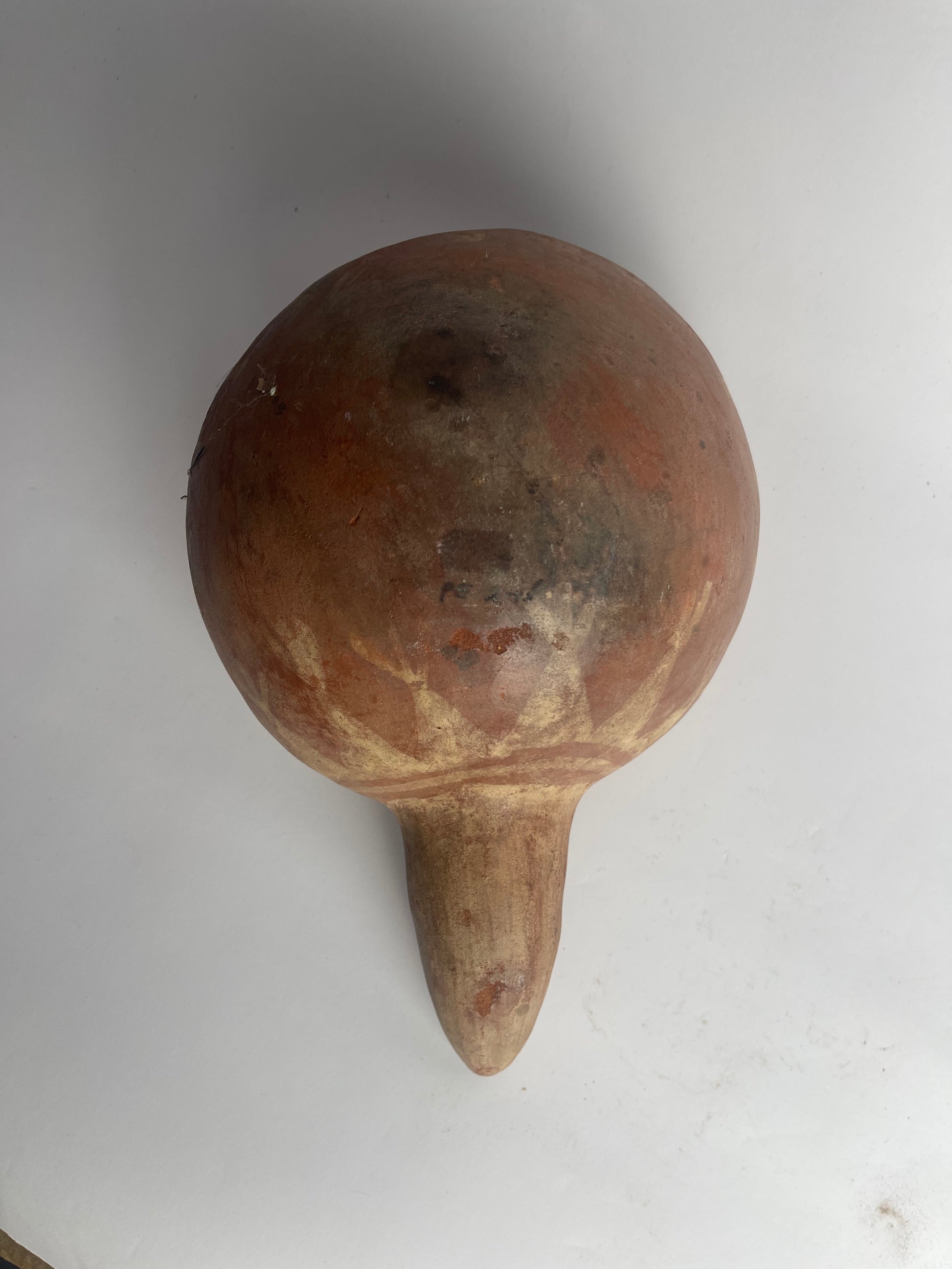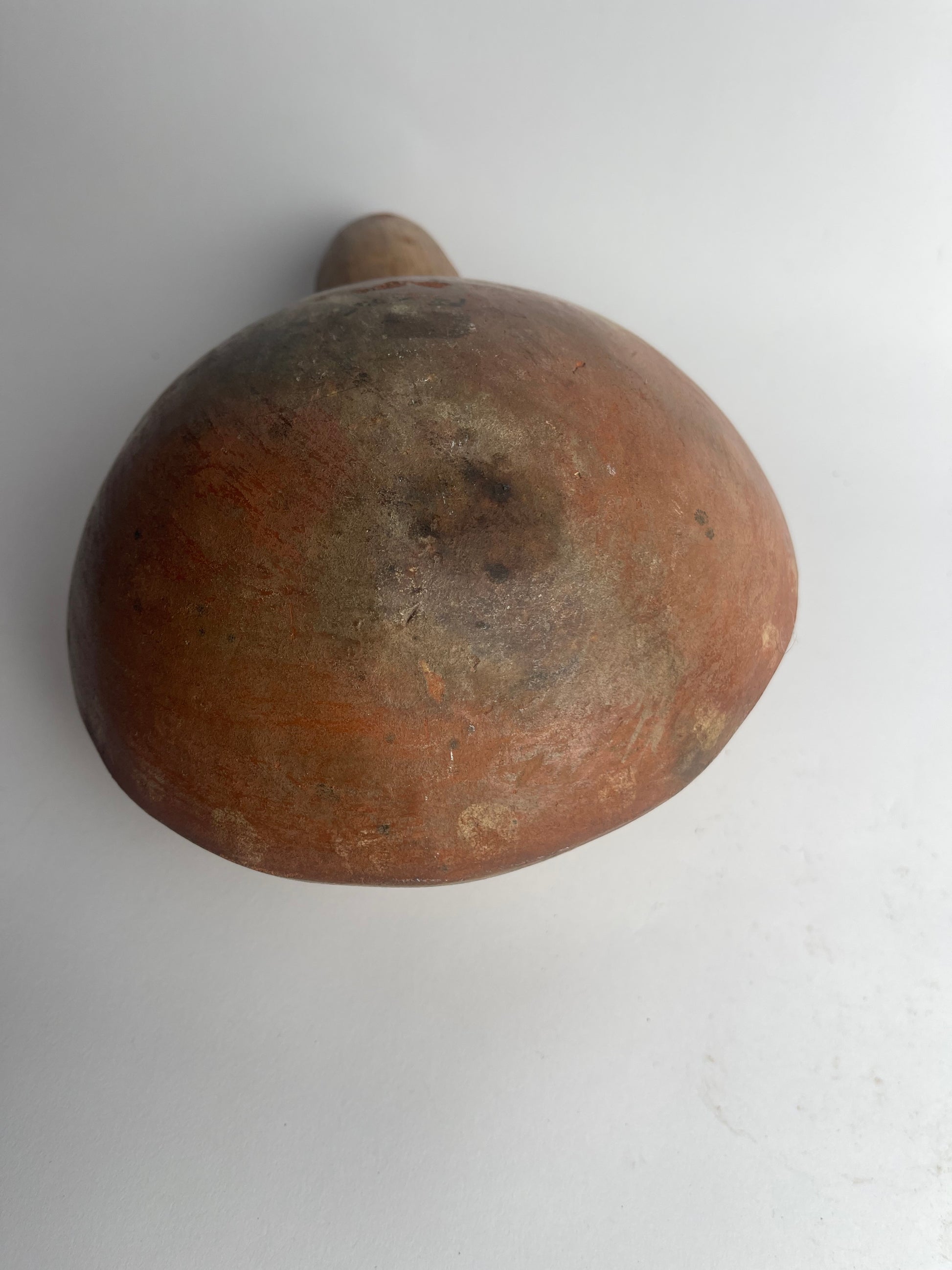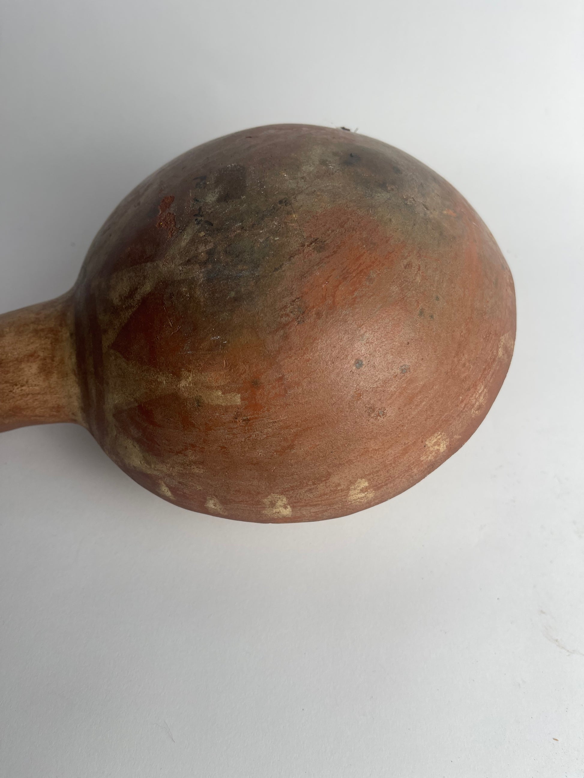 This Moche ceramic dipper, dating to circa 100–800 CE, is traditionally known as a “cornpopper,” though modern scholarship suggests its function was ritual rather than culinary. Made in northern Peru, the vessel consists of a long handle attached to a small, perforated bowl, carefully crafted from fine, burnished clay.
