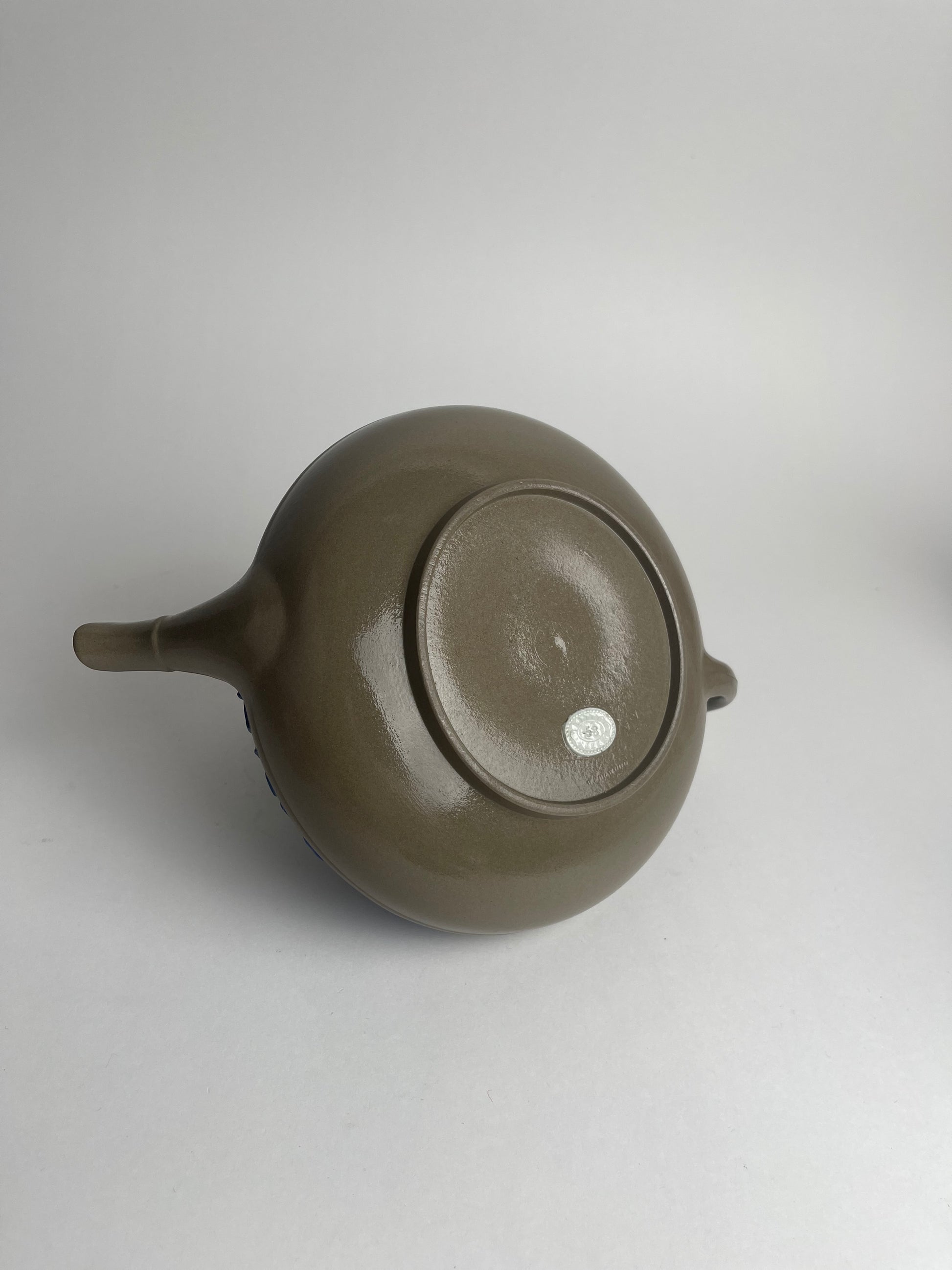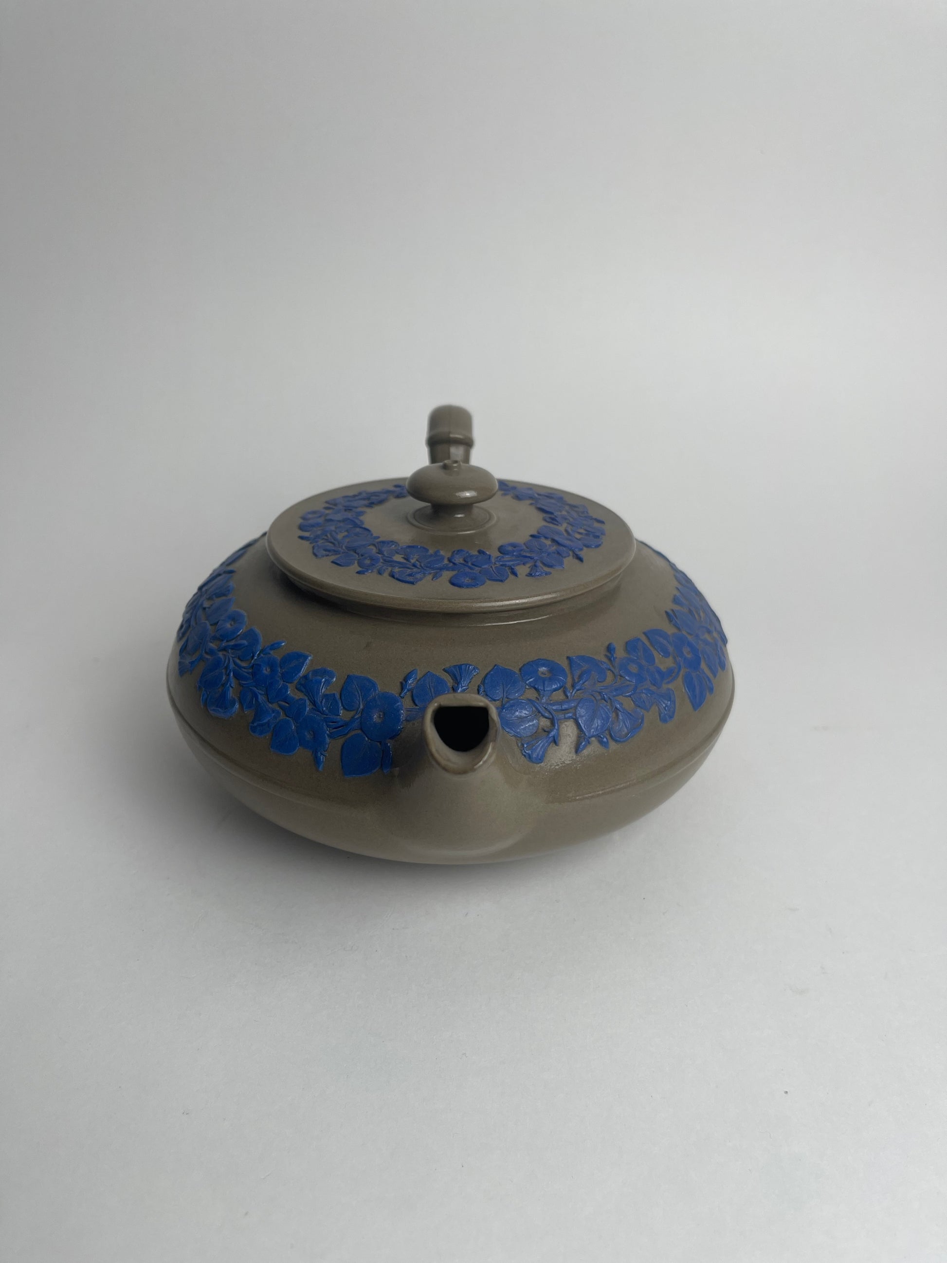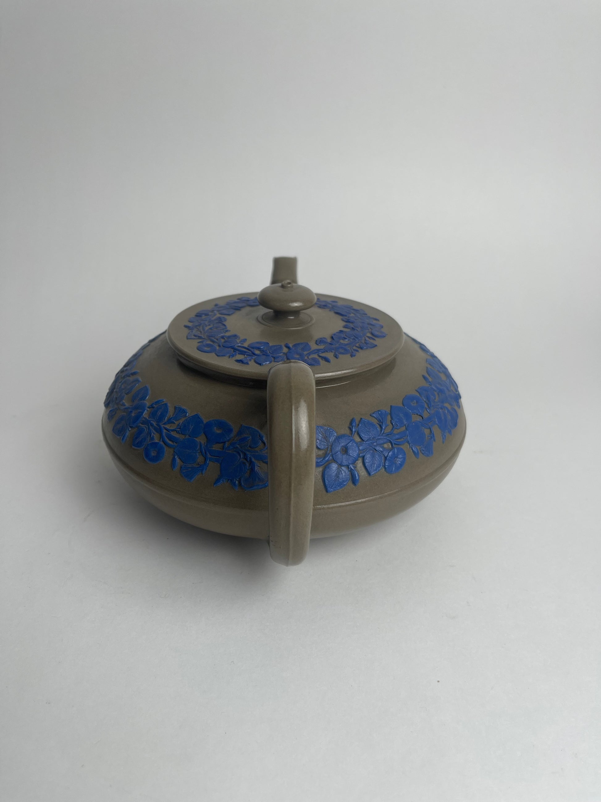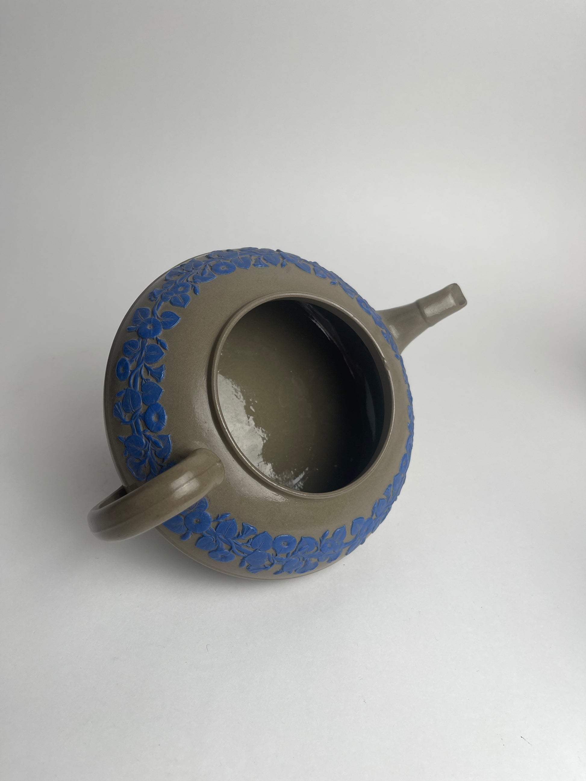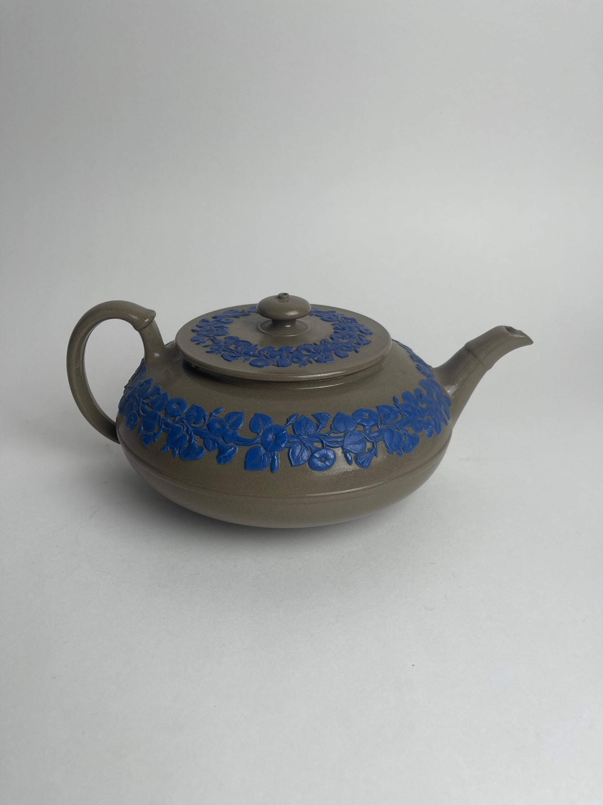This Wedgwood drabware stoneware teapot, dating to around 1830, is a beautifully refined example of the company's mastery of neoclassical design and technical innovation. The drab stoneware, with its muted, earthy tone, provides a striking contrast to the crisp blue relief decoration, which features a floral motif. The teapot is clearly marked “WEDGWOOD” along with the number "58", a typical factory mark that helps to date the piece.