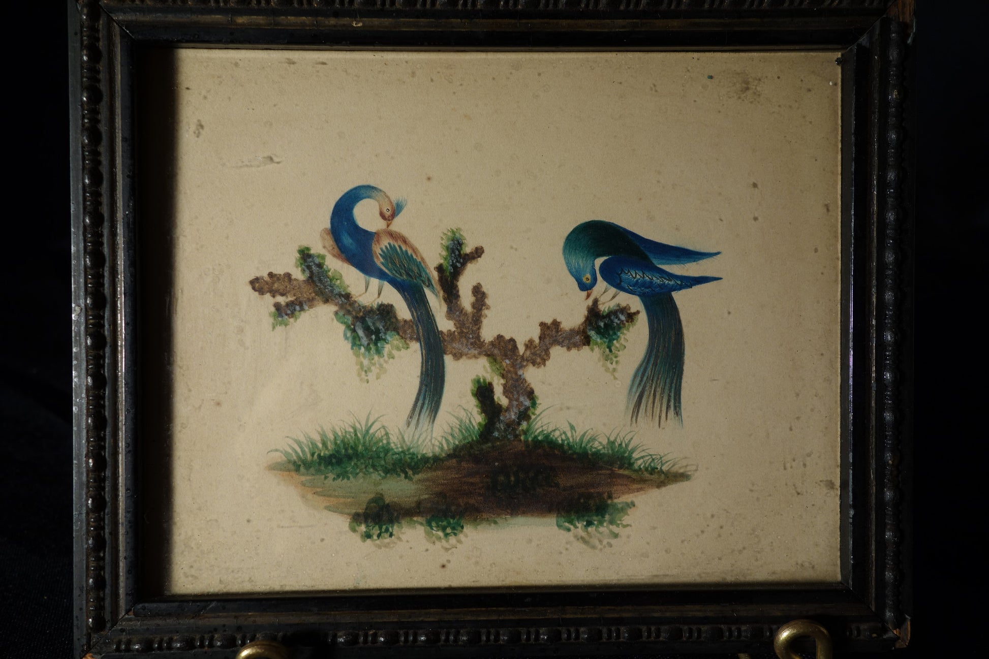 Extremely well done drawing of two exotic birds resting atop of a small bush. Decorated with paint and subtle gilding. Very unusual poses.