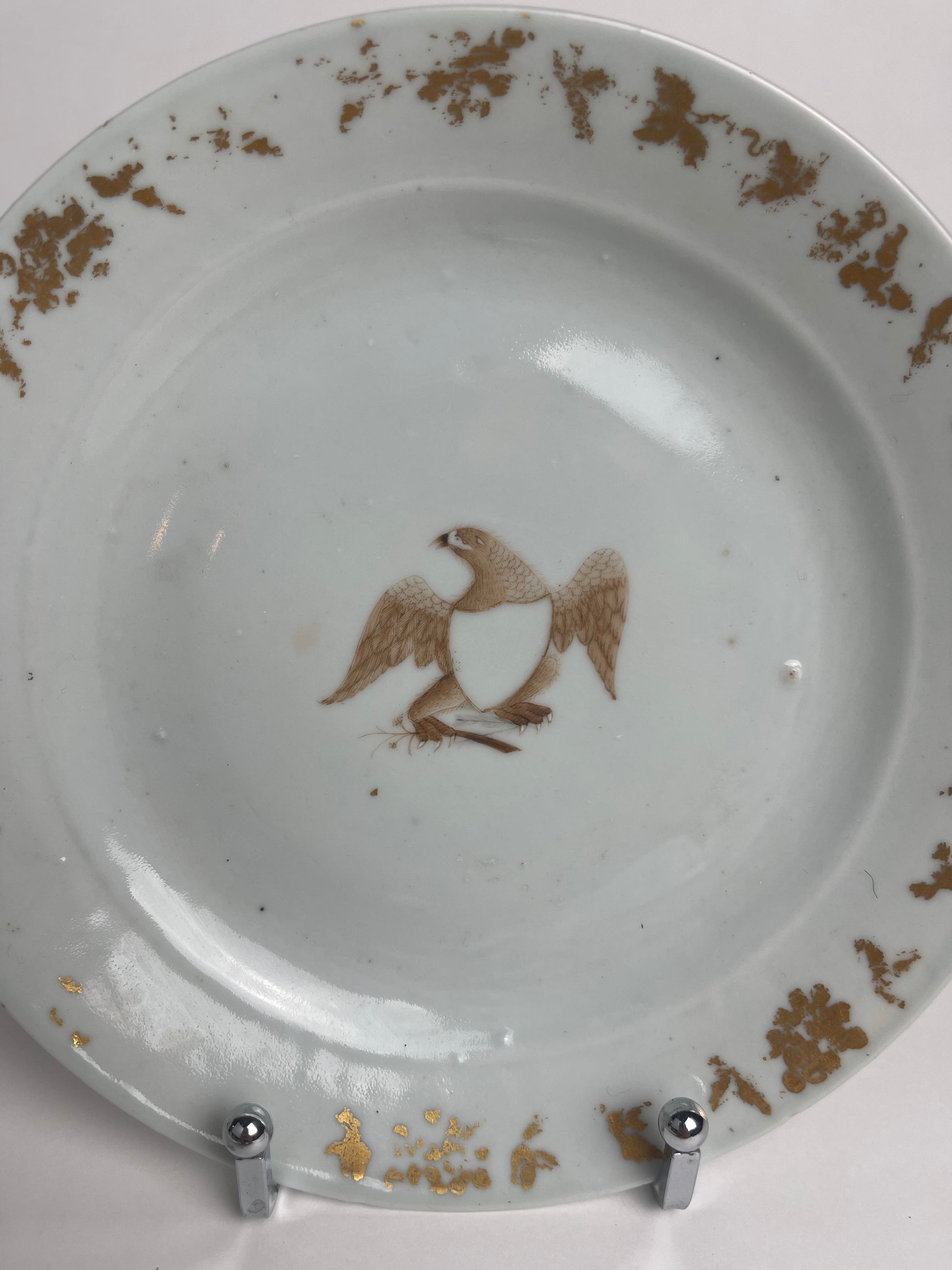 These Chinese export plates, commissioned by the Hemingway family of New York, are a rare and elegant example of 19th-century porcelain made for the American market. Bearing the initials H.L.H. and a boldly painted eagle—these plates were part of a custom service, commissioned to reflect both personal identity and national pride. The fine porcelain body, with its smooth glaze and delicate hand-painted decoration, showcases the exceptional skill of Chinese artisans who catered to Western tastes while maintaining their own artistic traditions.