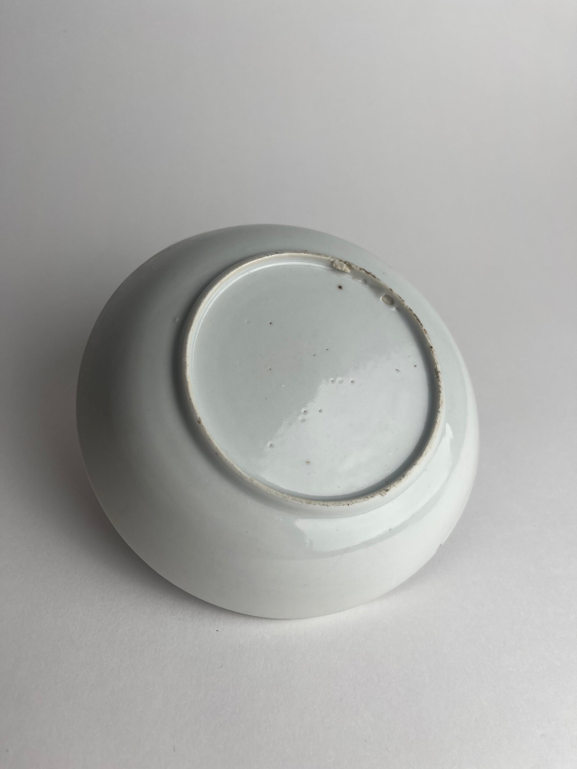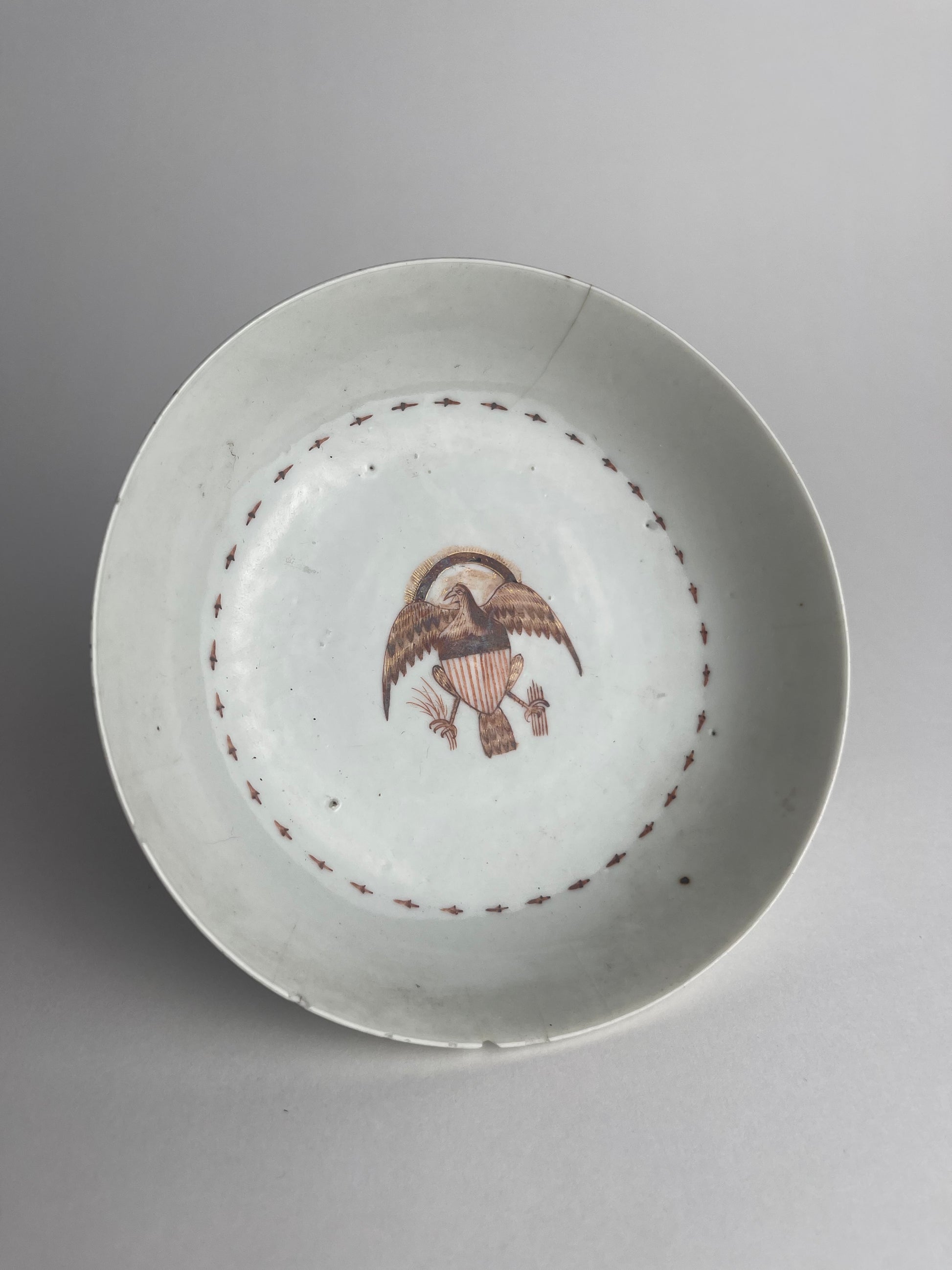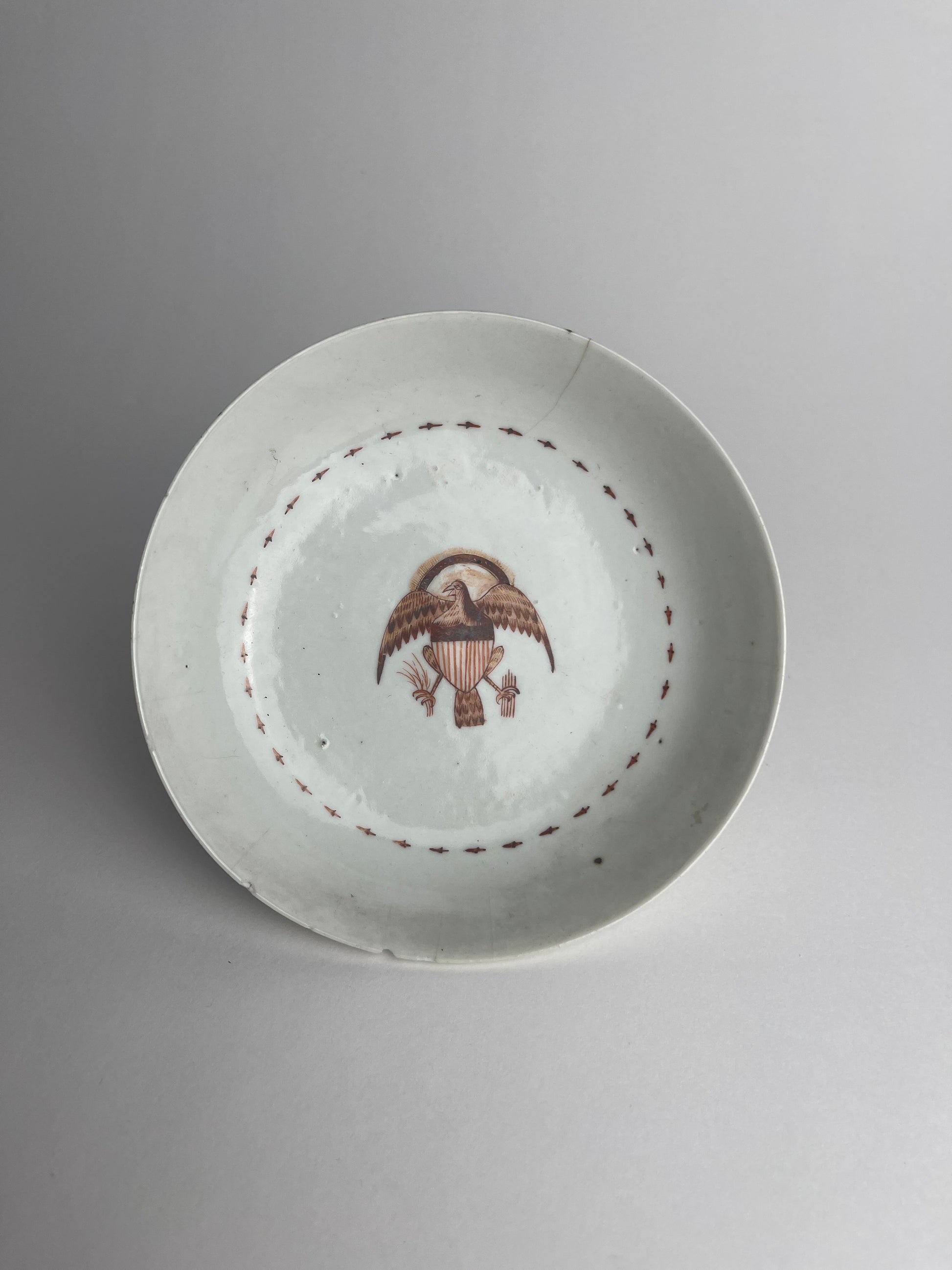This Chinese export porcelain saucer, dating to the late 18th or early 19th century, features a striking eagle motif at its center—a clear nod to the growing demand for patriotic imagery from the American markets during the Federal period. The eagle, depicted with outstretched wings, clutching arrows and an olive branch, draws inspiration from the Great Seal of the United States and symbolized strength, independence, and unity.