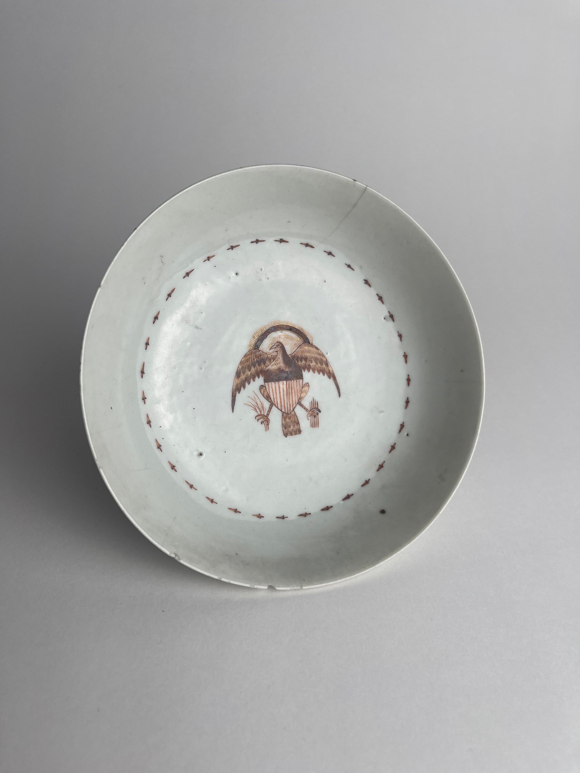 Hand-painted in enamel overglaze, the eagle is framed by a decorative border—with gilding, floral garland and other neoclassical elements, reflecting American tastes. Saucers like this were part of specially commissioned services, ordered by merchants, diplomats, and wealthy families eager to display their national pride through fine Chinese porcelain.