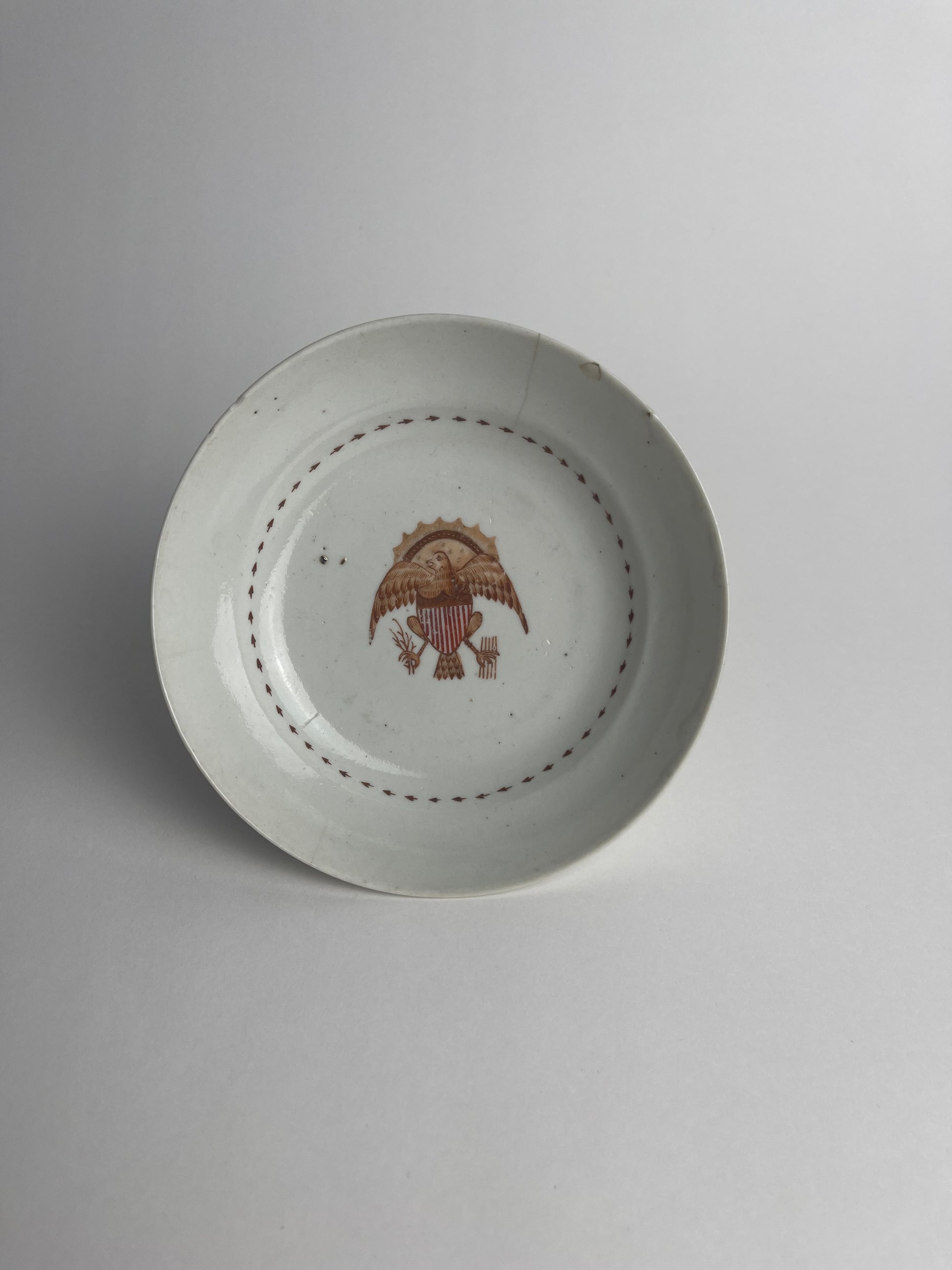 Hand-painted in enamel overglaze, the eagle is framed by a decorative border—with gilding, floral garland and other neoclassical elements, reflecting American tastes. Saucers like this were part of specially commissioned services, ordered by merchants, diplomats, and wealthy families eager to display their national pride through fine Chinese porcelain.