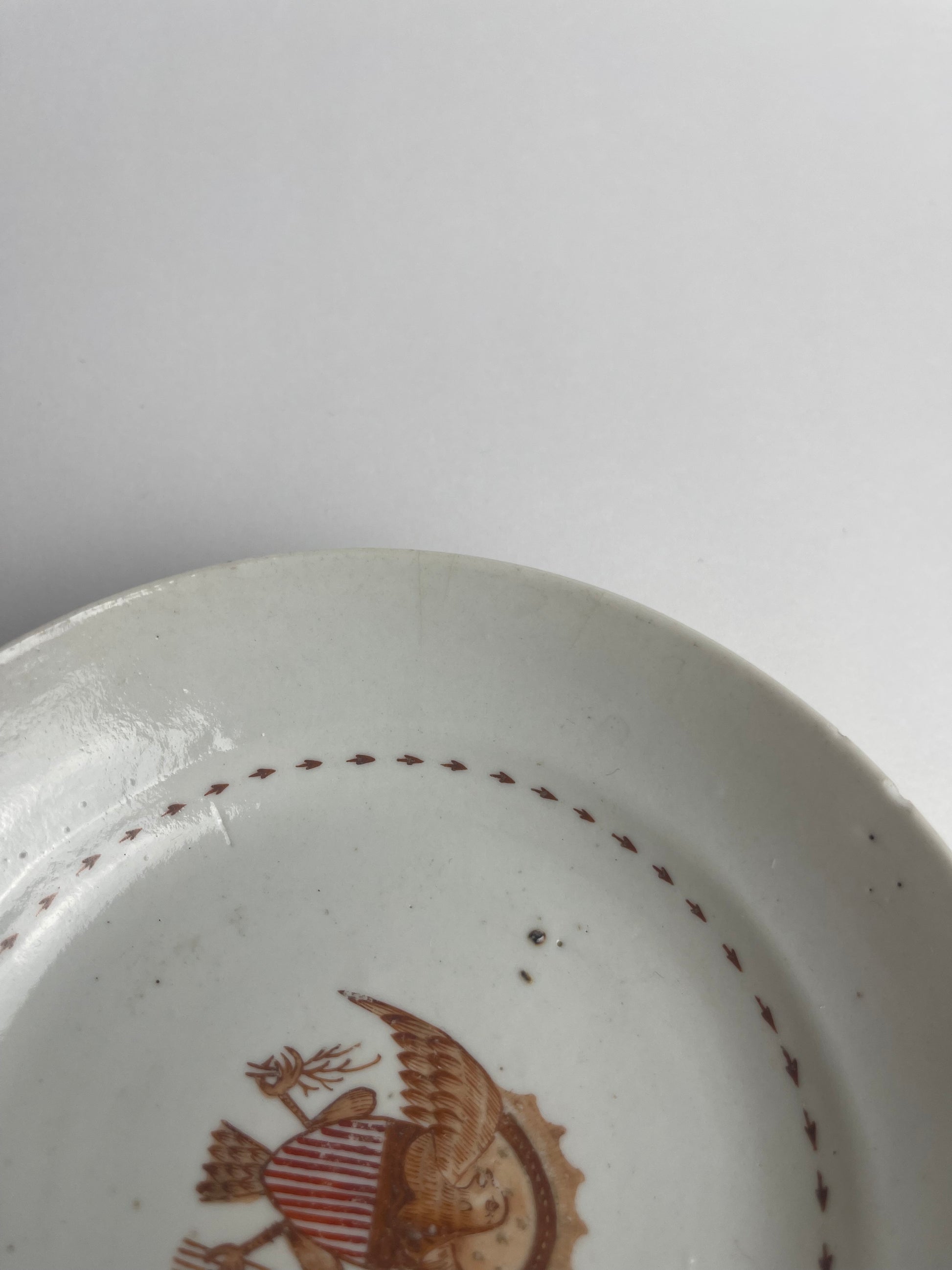 This Chinese export porcelain saucer, dating to the late 18th or early 19th century, features a striking eagle motif at its center—a clear nod to the growing demand for patriotic imagery from the American markets during the Federal period. The eagle, depicted with outstretched wings, clutching arrows and an olive branch, draws inspiration from the Great Seal of the United States and symbolized strength, independence, and unity.