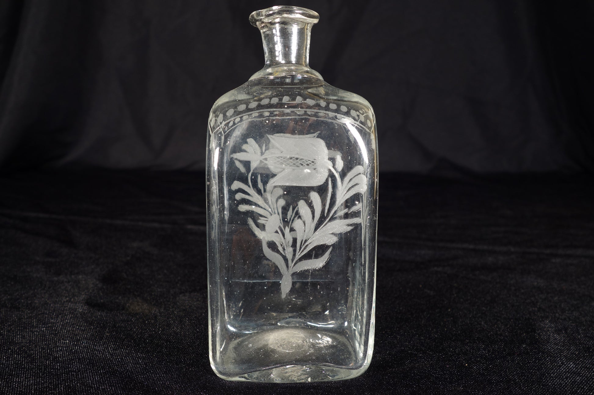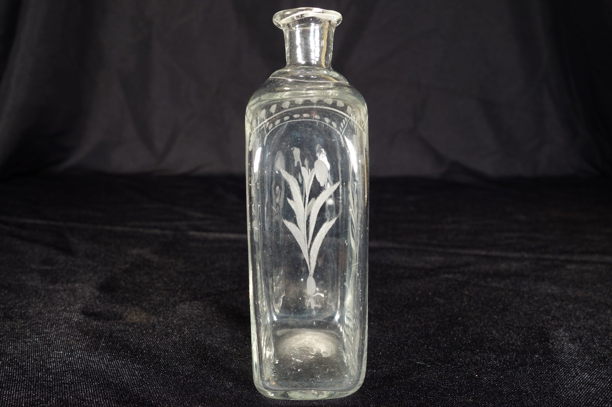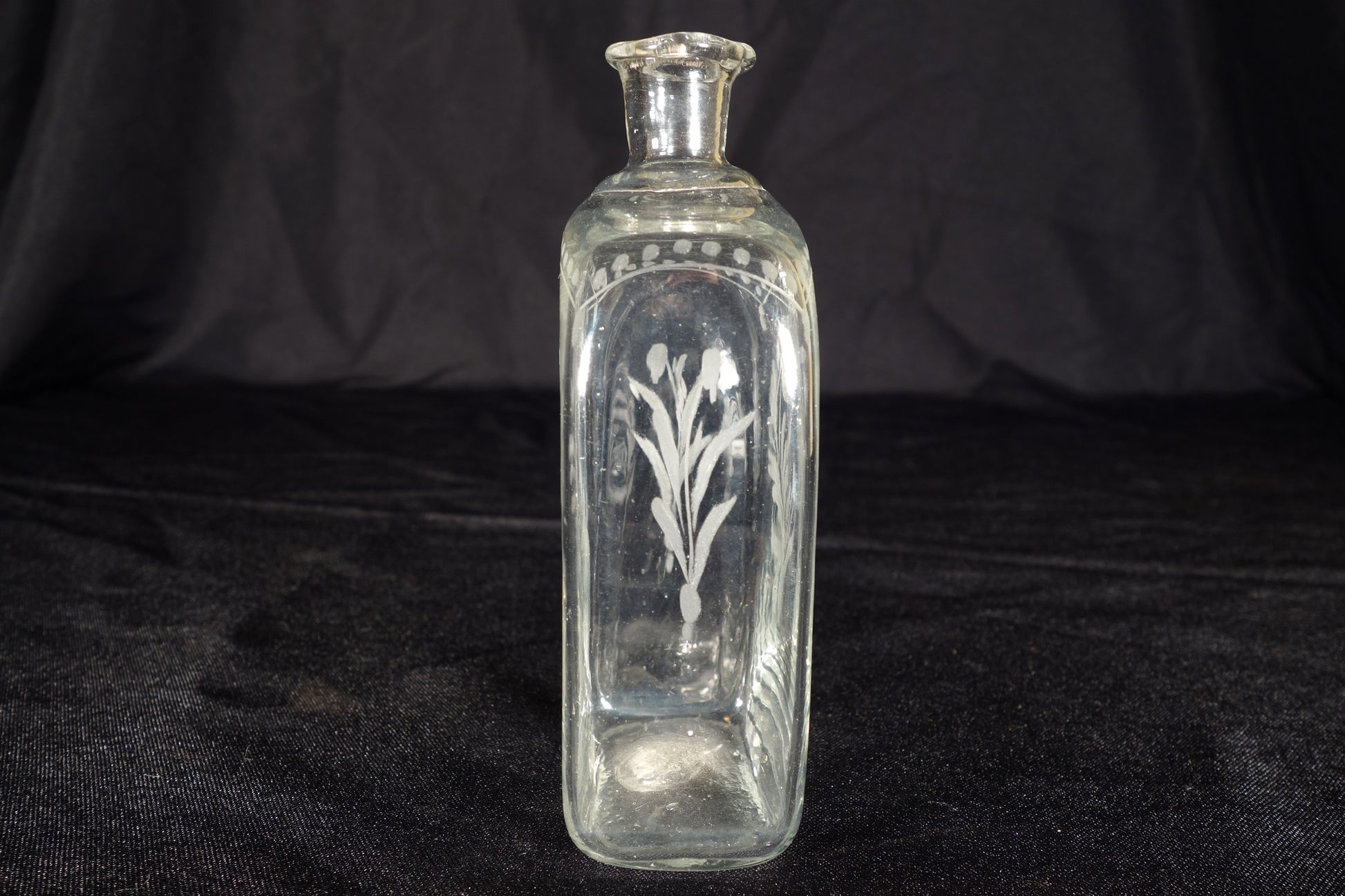 A nice small decanter with floral etching on the front and back faces. Wonderfully thin glass, as is typical with bohemian products from this period.
