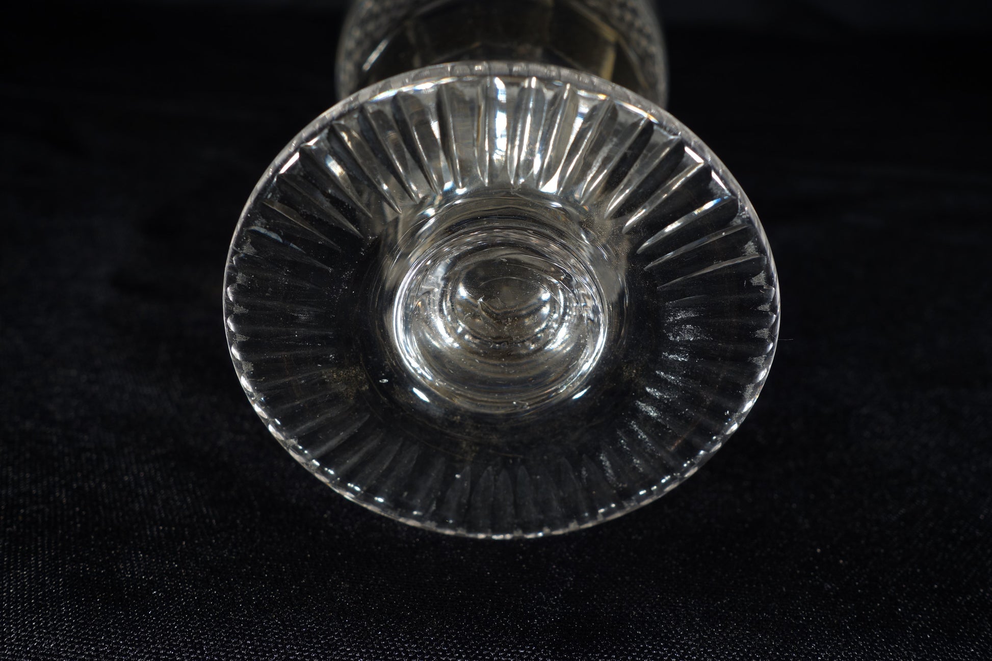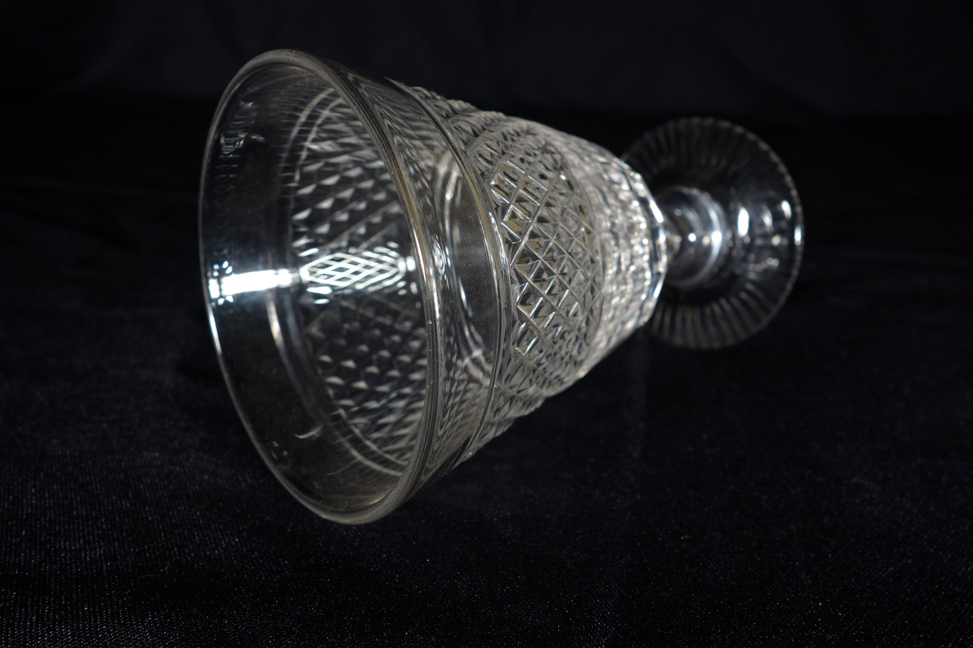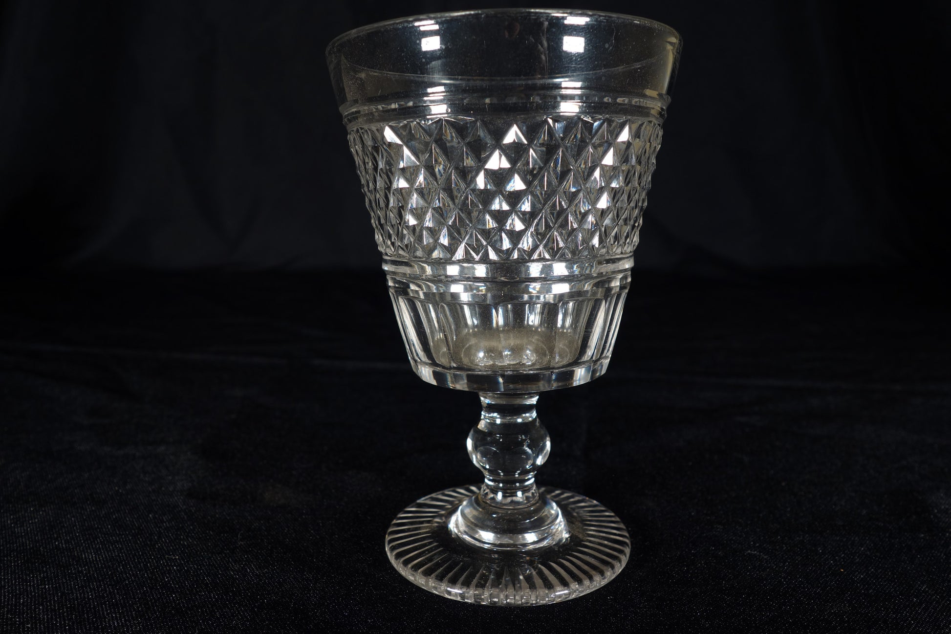 A breathtaking cut glass water class with intricate diamond cutting and facets on the bowl, a faceted knop in the stem, and a nicely cut foot.