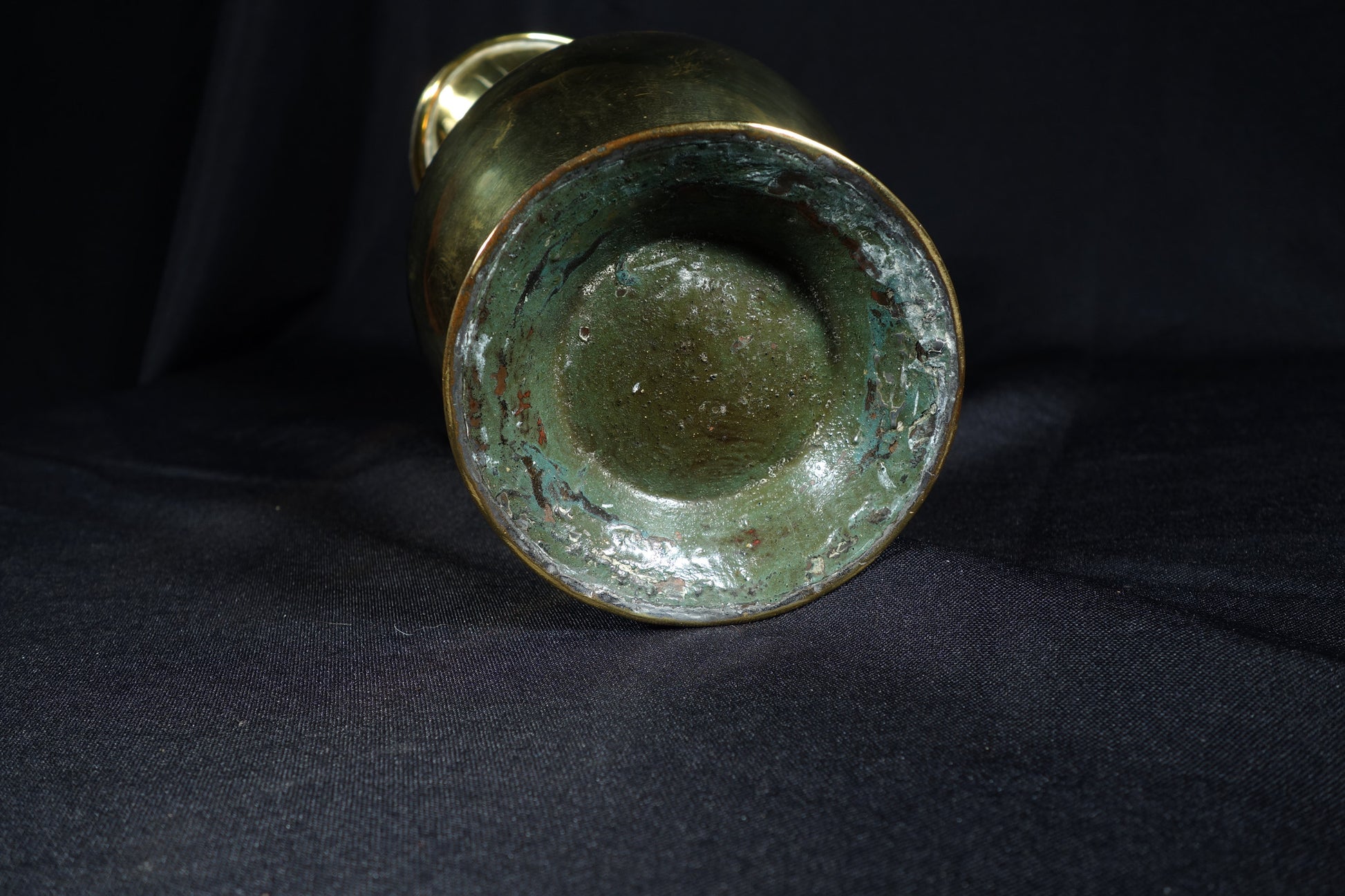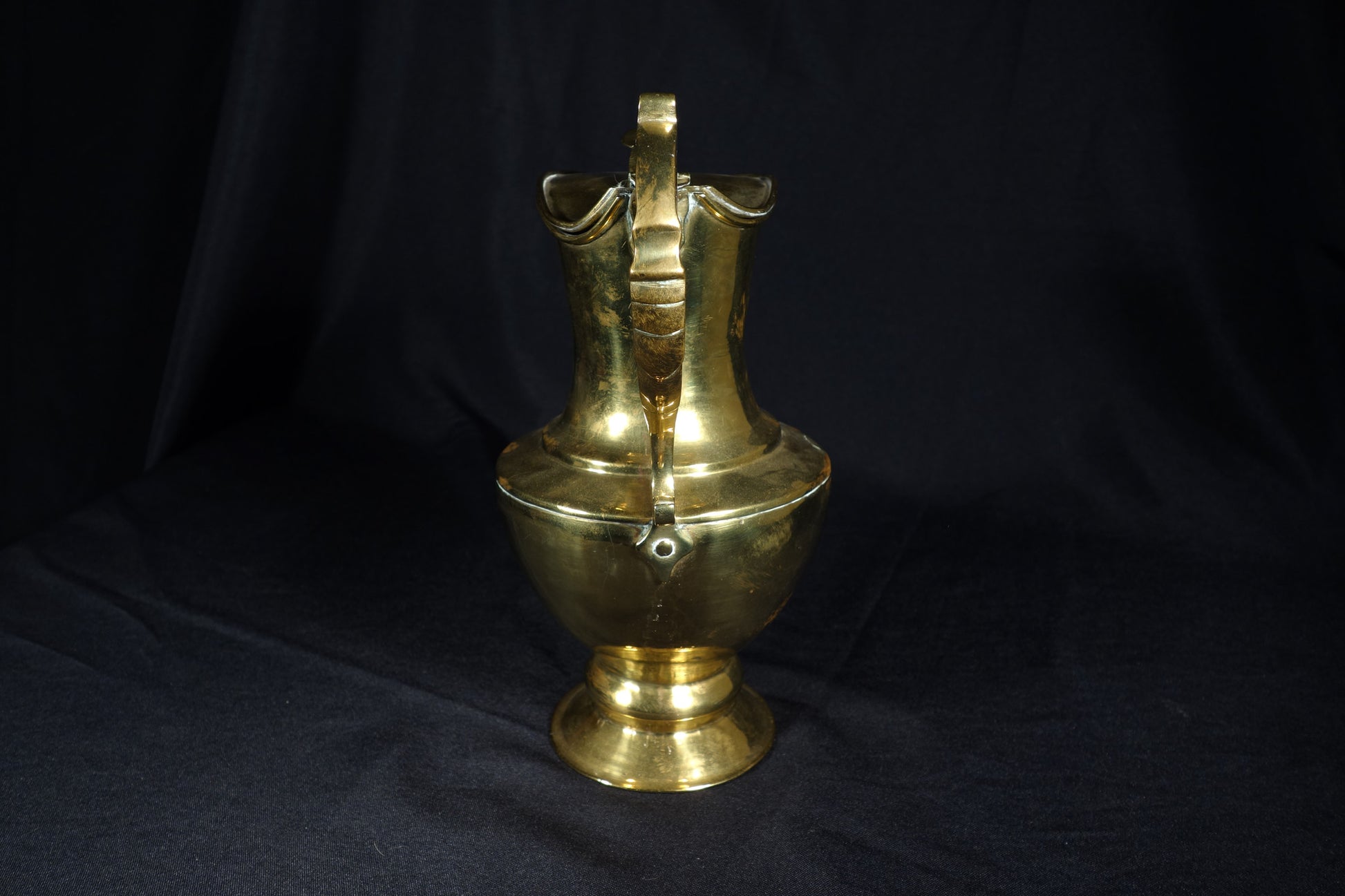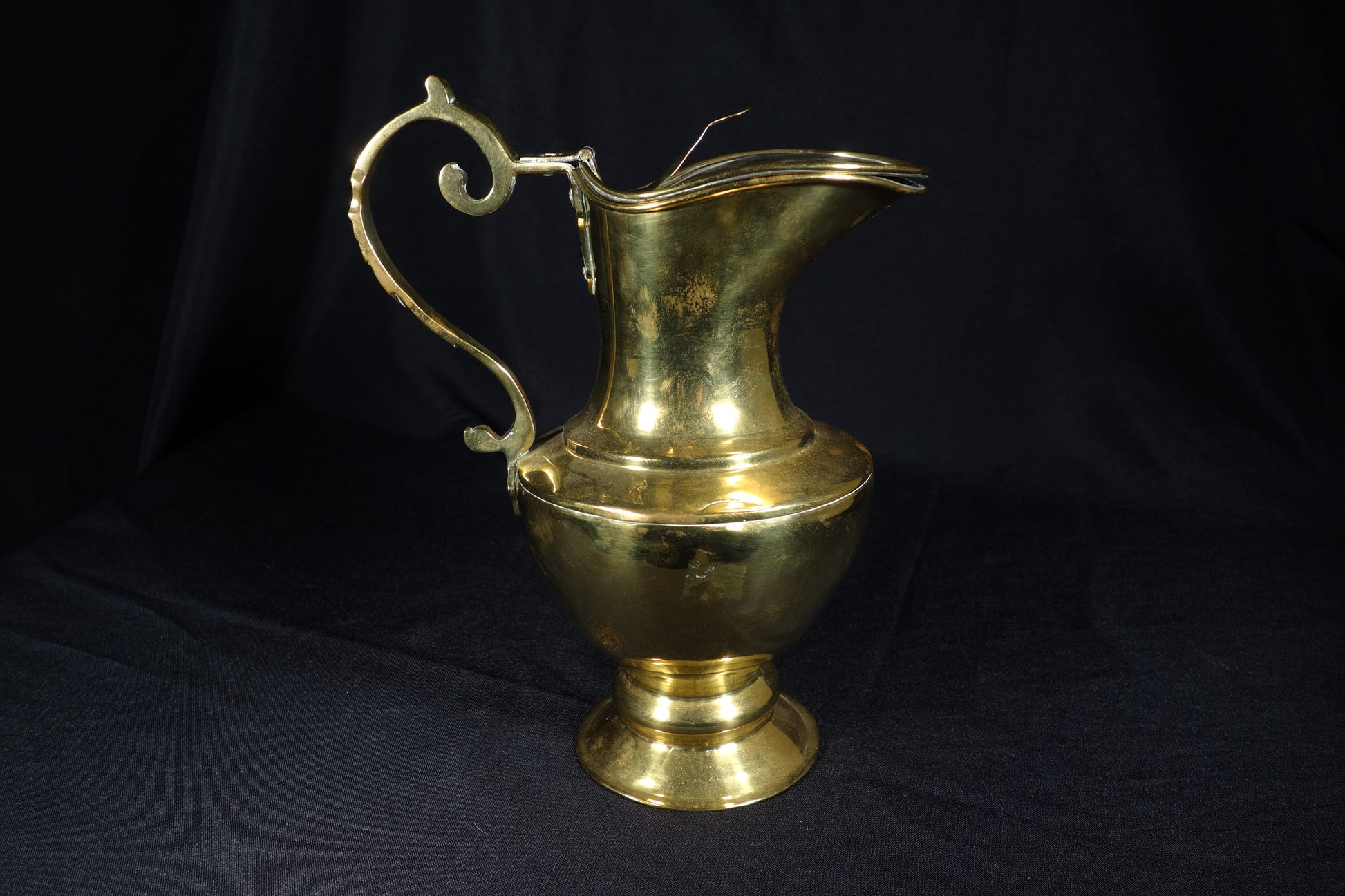 An incredibly large brass pitcher with a finely scrolled handle and nice classical shape. The pitcher is held together with a dovetailed seam which still holds strong.