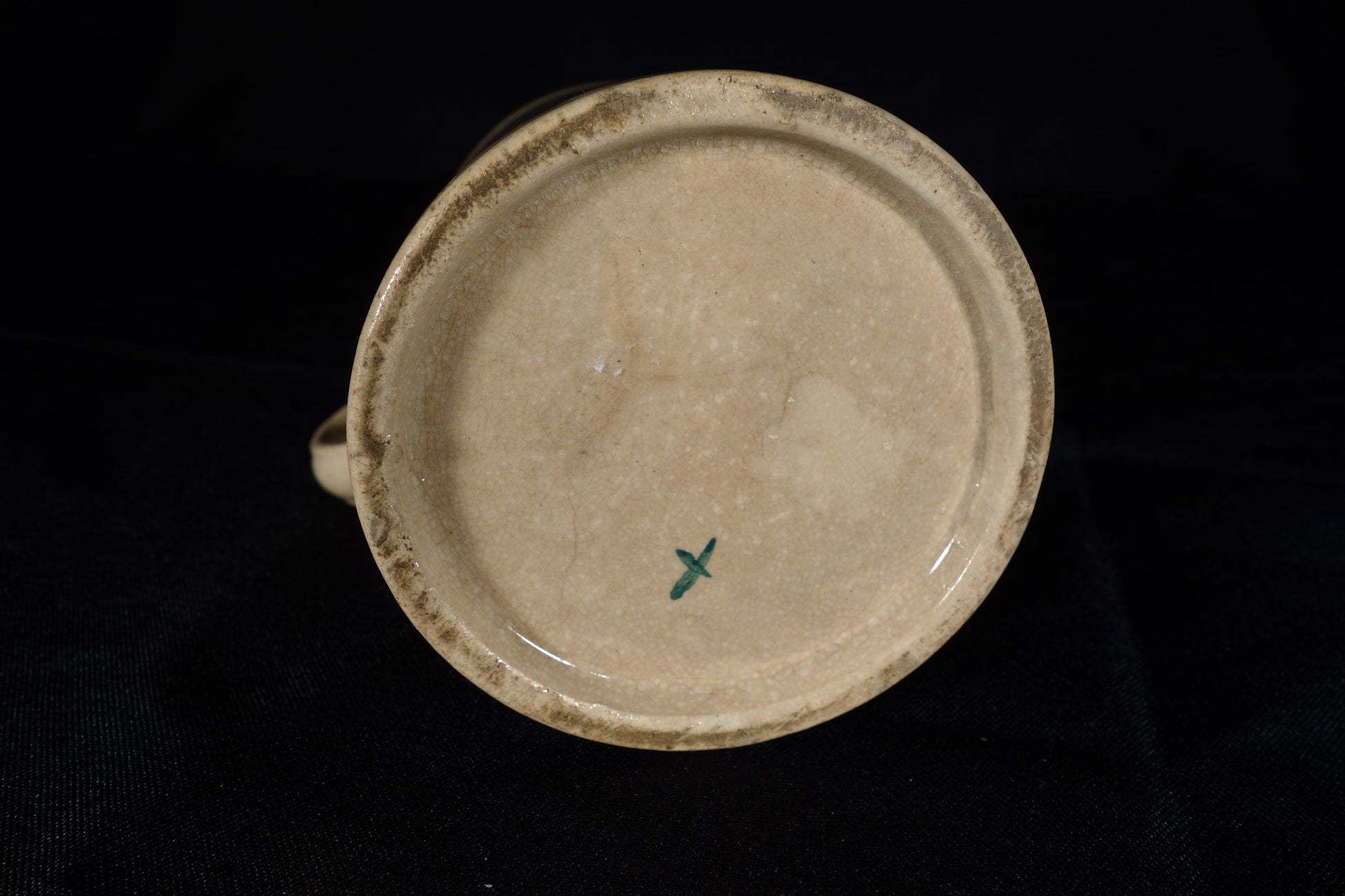 A very nice mocha ware mug with dendritic decoration extending up from the base rim above a deep green ground.