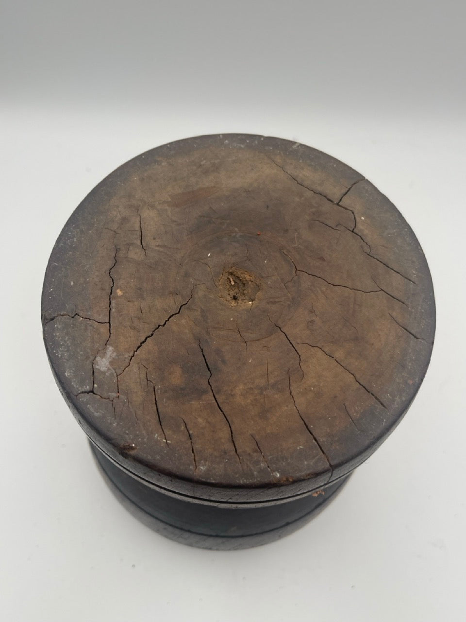 This 19th-century wooden mortar showcases the rustic charm and functionality of early kitchen and apothecary tools. Expertly hand-carved from a solid block of hardwood, it features a smooth, cylindrical form with a deep, well-worn interior, testifying to years of use in grinding herbs, spices, or medicinal ingredients. The rich patina developed over time highlights the natural grain of the wood, adding to its warm, aged character. A practical yet beautifully crafted object, this mortar reflects the resourcefulness of 19th-century households and remains a wonderful addition to any collection of antique kitchenware or early woodenware.