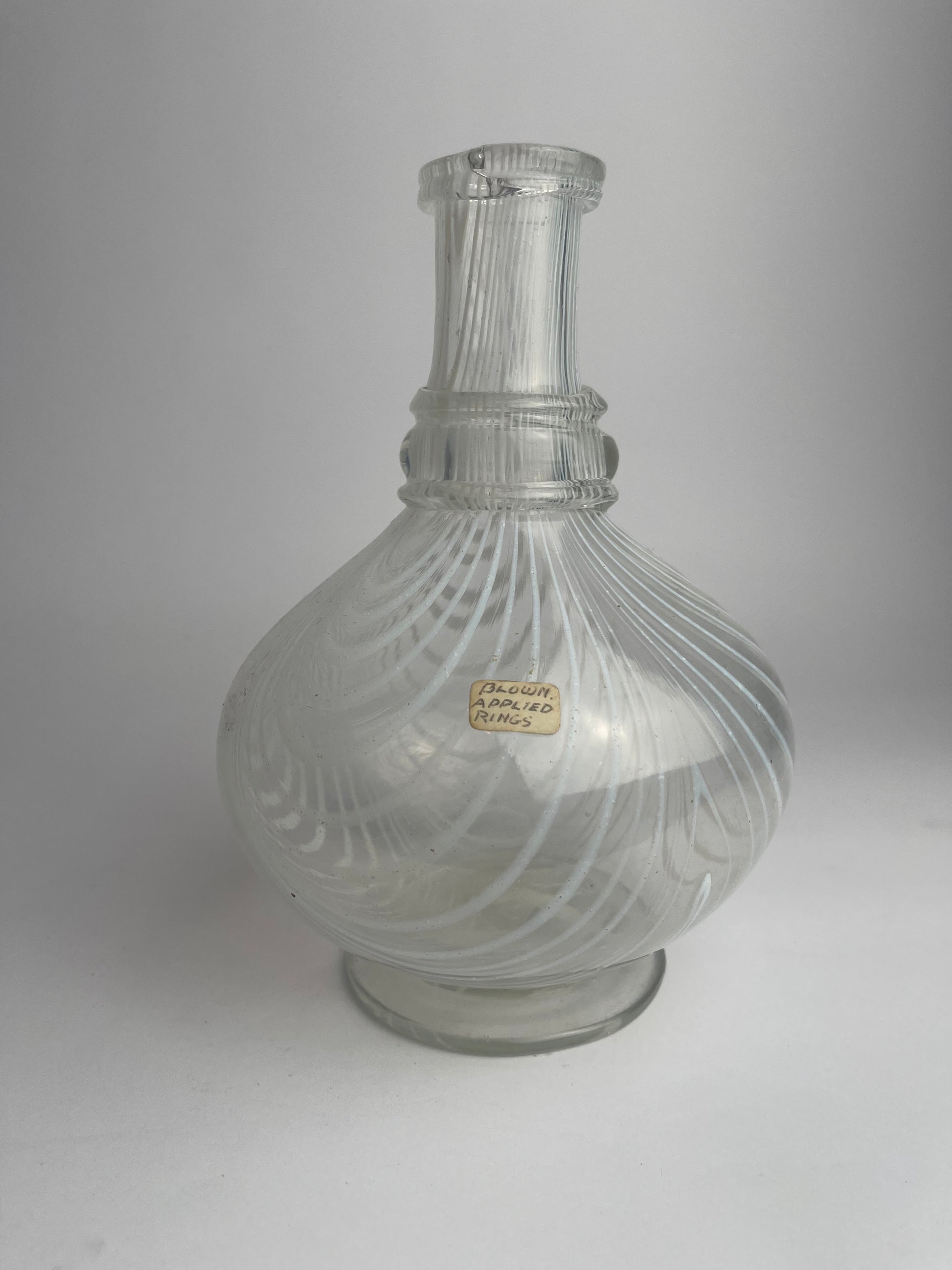 This Nailsea glass decanter, dating to the early 19th century, is blown in clear glass with applied opaque white loops spiraling across the body. The long neck tapers to a broad base, the surface animated by the rhythmic trails of contrasting glass worked while hot.