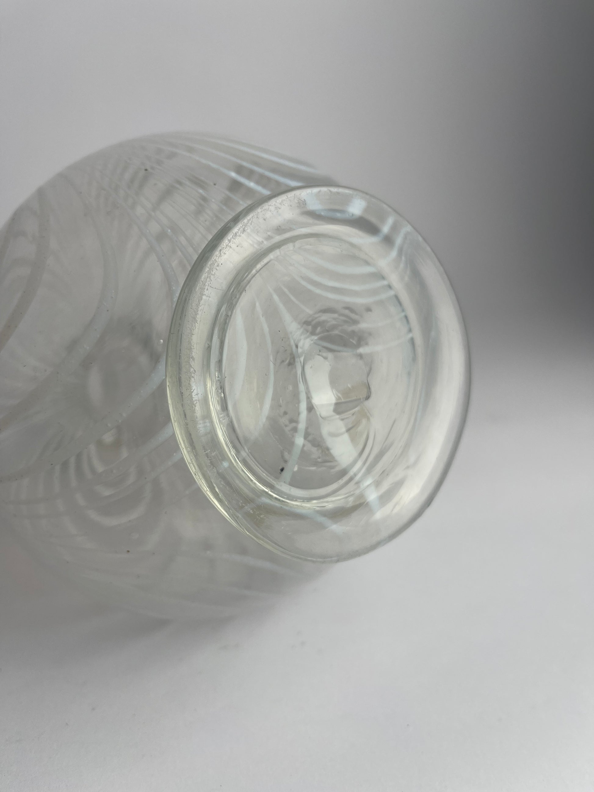 The interplay of clear glass and white looping decoration makes this a distinctive and lively survival of English country glass, prized today for its rustic charm and hand-crafted character.