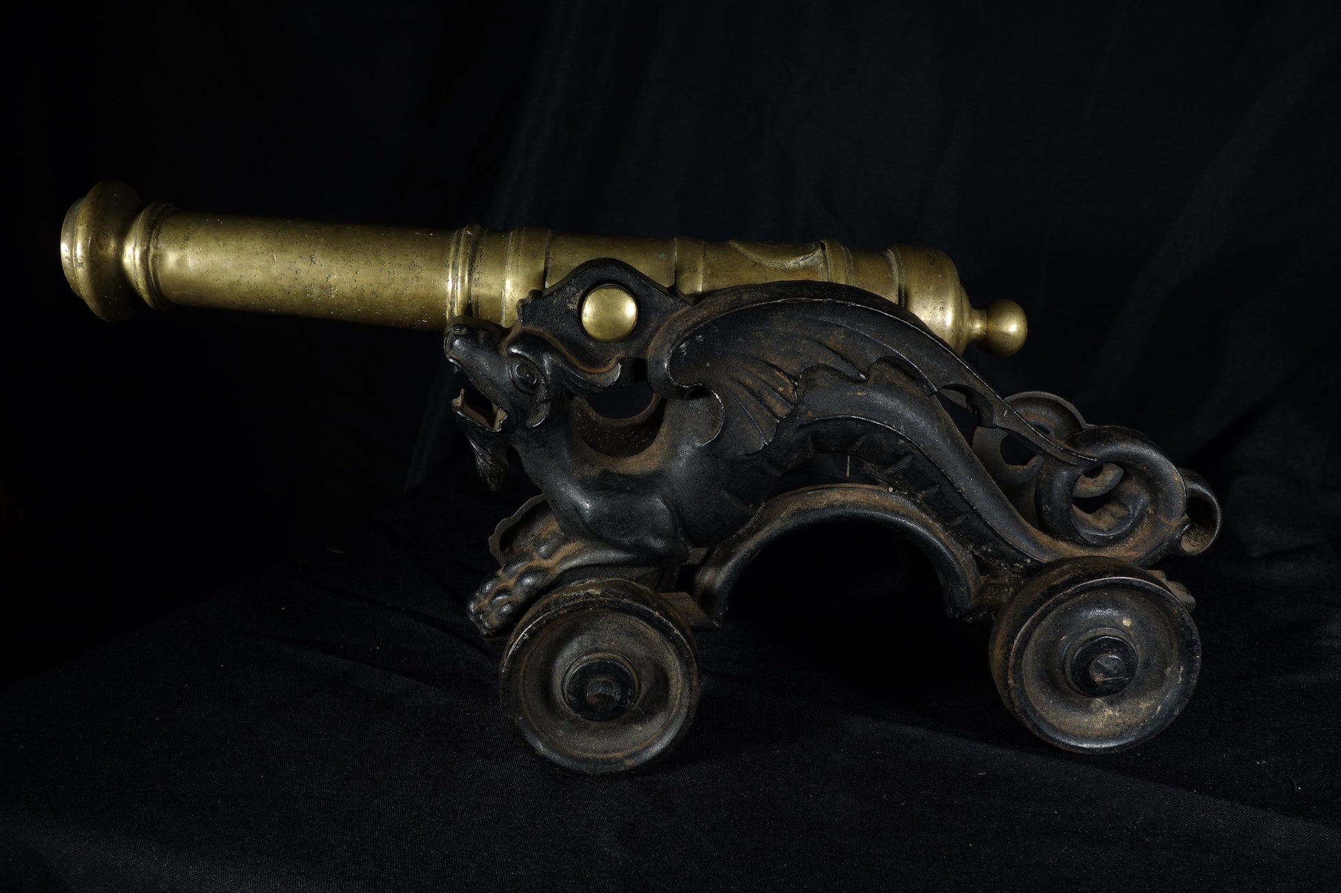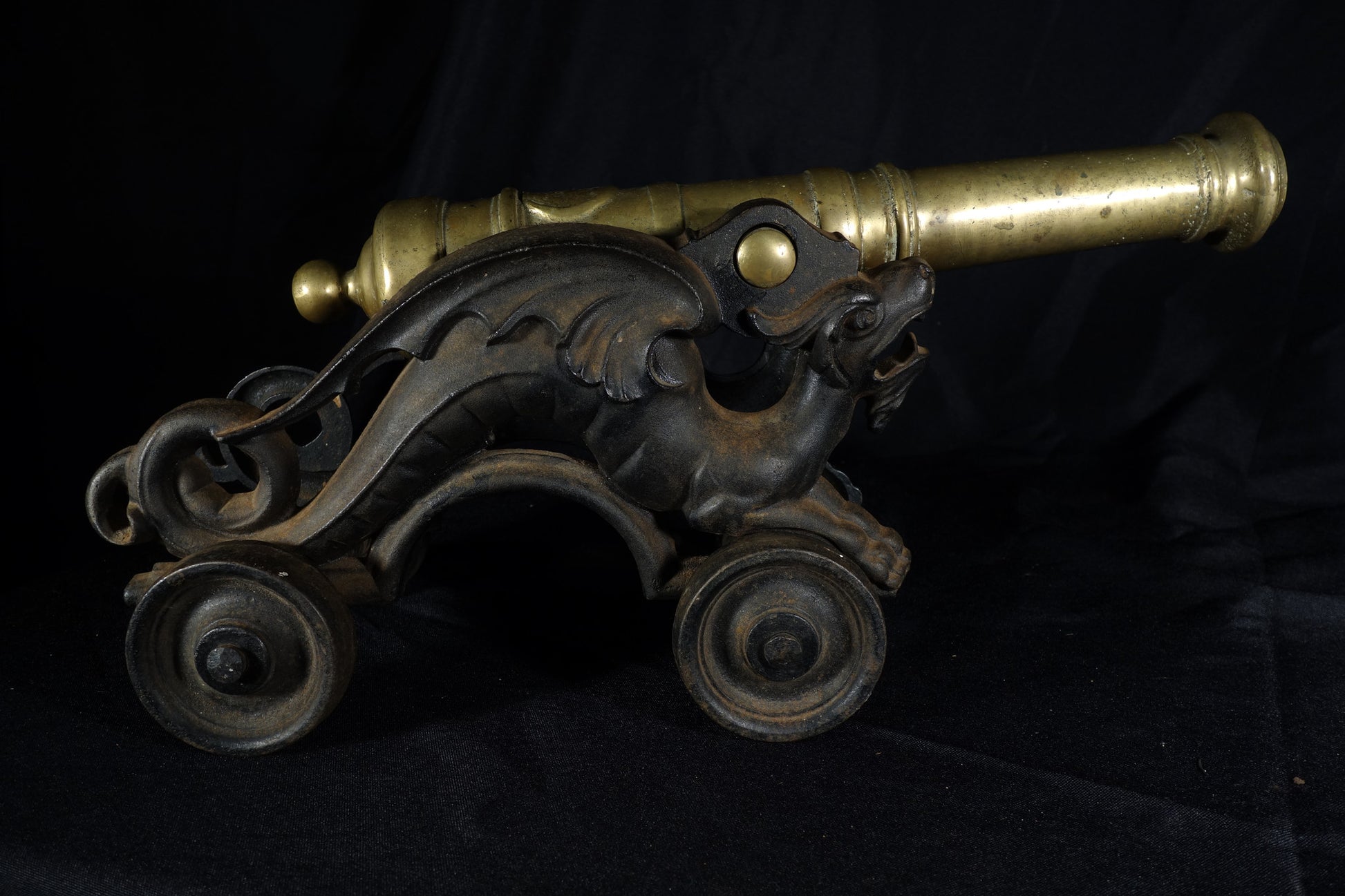 There beautiful signal cannons would have been used on a yacht in the early 20th century. They feature boldly cast dragons and a beautiful bronze barrel. The price is for the pair.