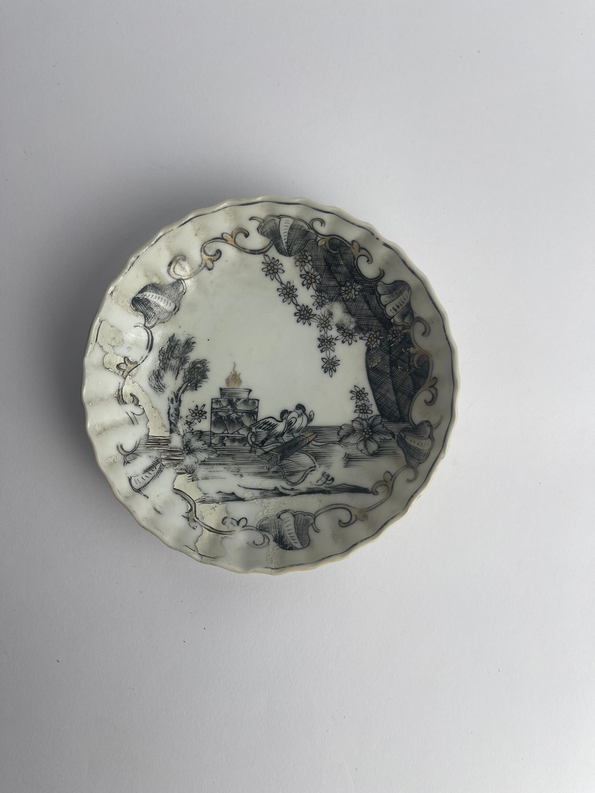 This Chinese export porcelain saucer dish, dating to the mid-18th century, is decorated in grisaille and gilt with a design known as “Amorous Trophies.”
