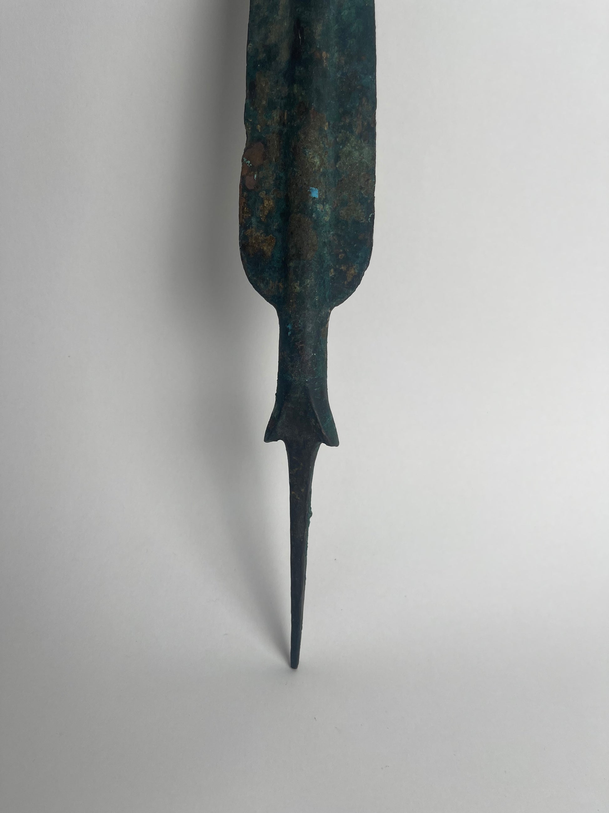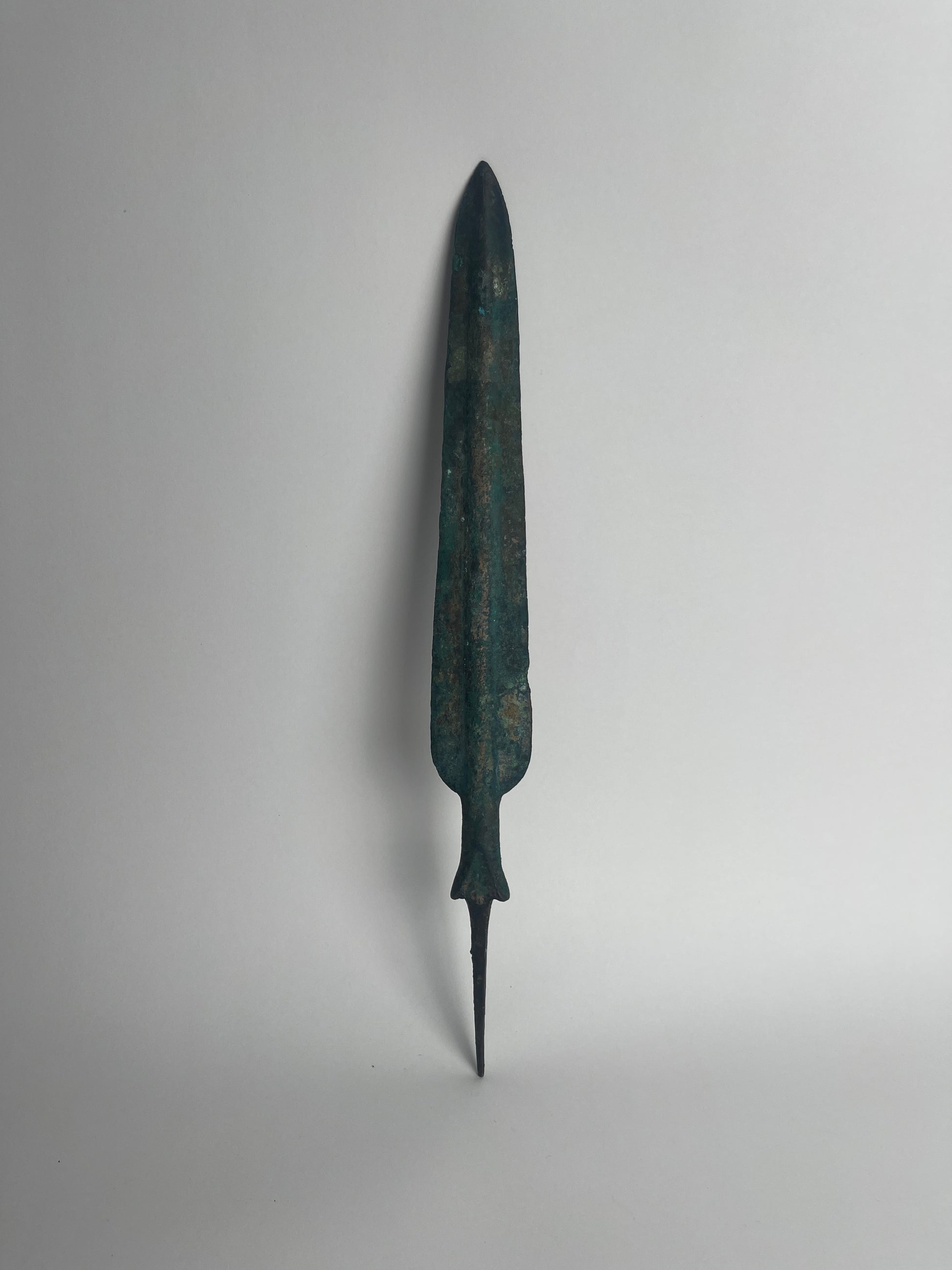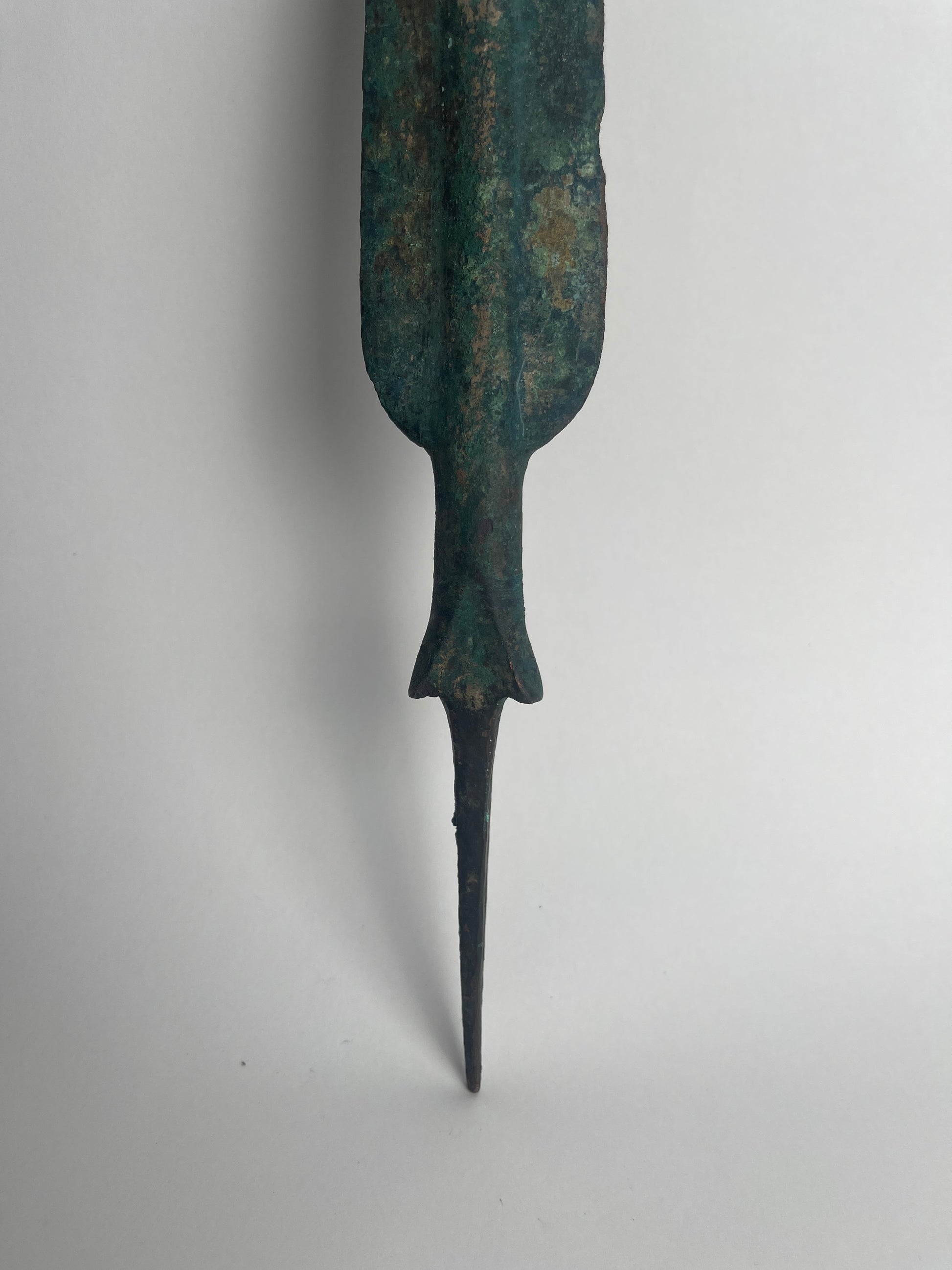 This Luristan bronze spear point, dating from 2nd millennia BCE, is a powerful testament to the craftsmanship and martial culture of ancient northwestern Iran. The spearhead features a leaf-shaped blade with a strong central ridge for added strength and penetration. The tang or socketed base would have been fitted onto a wooden shaft, making it a formidable weapon in both hunting and warfare.