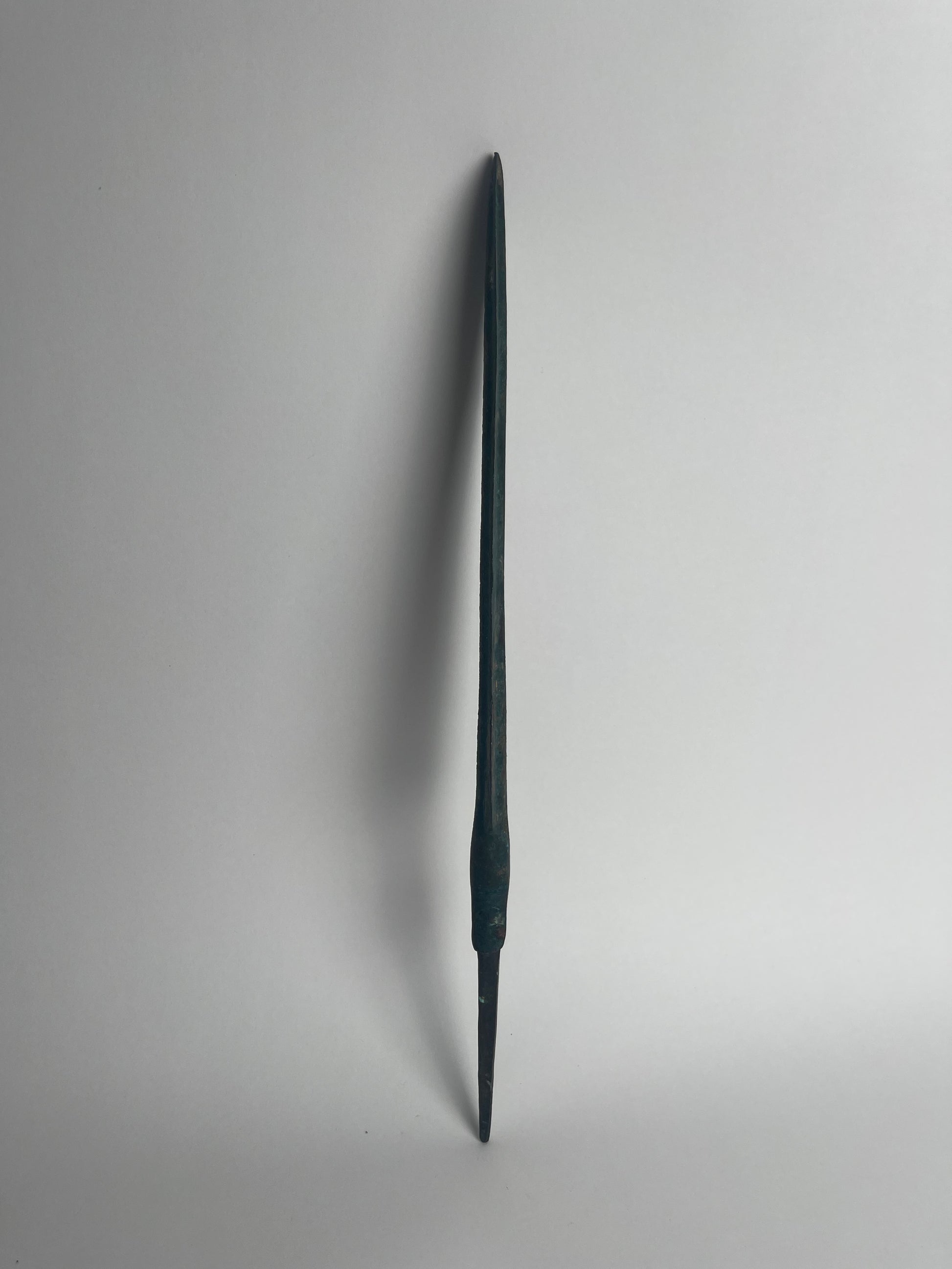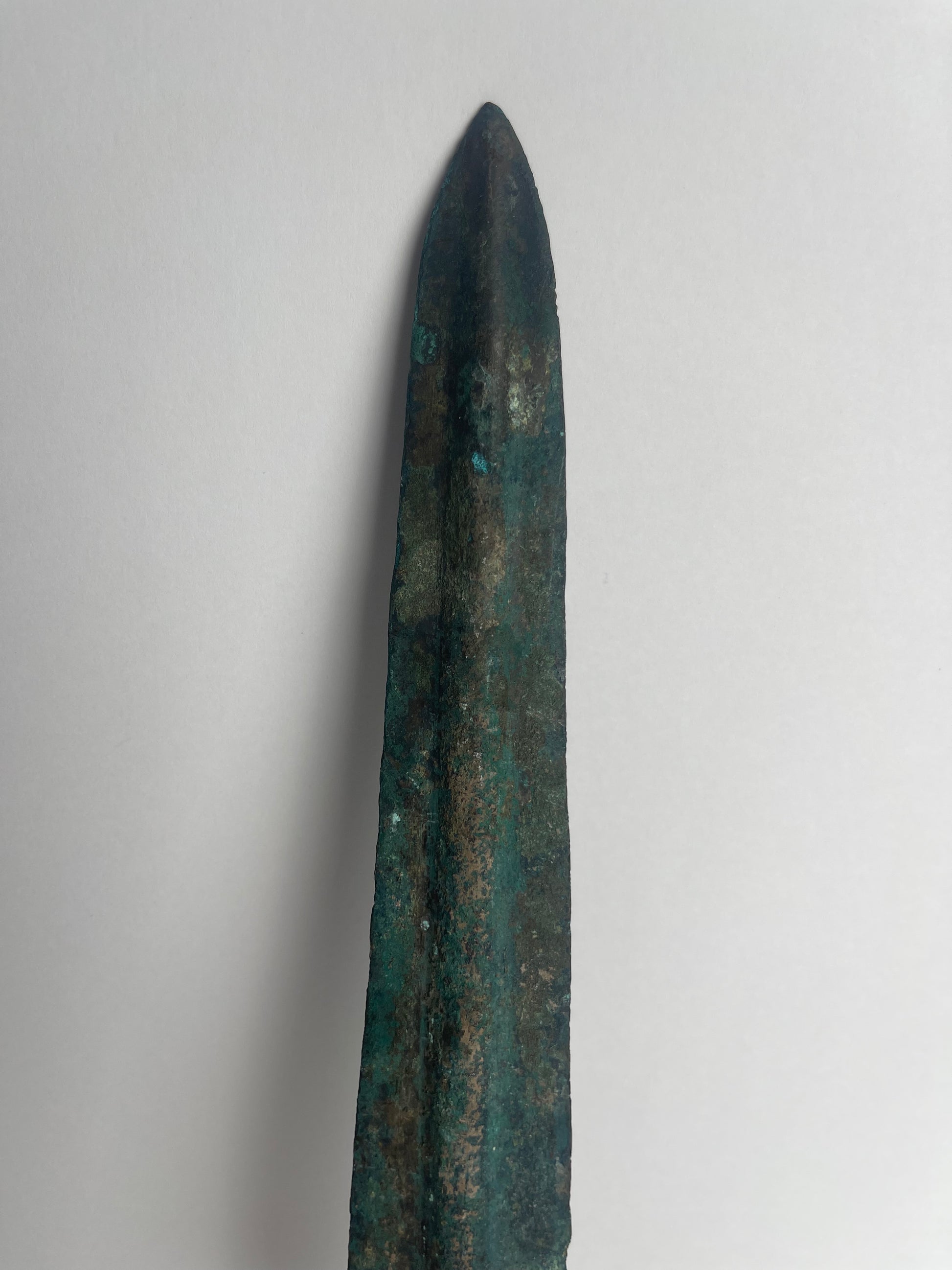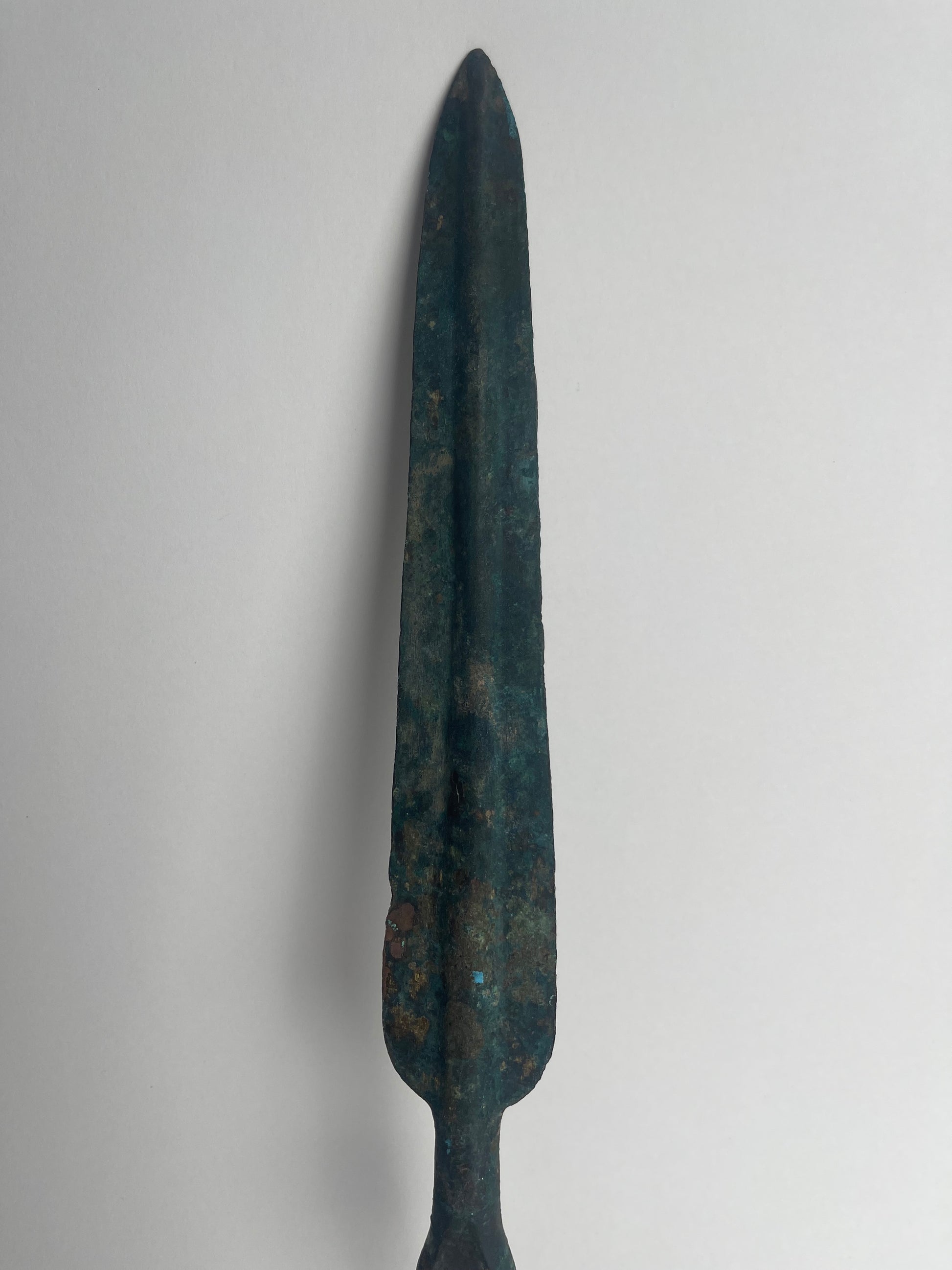 This Luristan bronze spear point, dating from 2nd millennia BCE, is a powerful testament to the craftsmanship and martial culture of ancient northwestern Iran. The spearhead features a leaf-shaped blade with a strong central ridge for added strength and penetration. The tang or socketed base would have been fitted onto a wooden shaft, making it a formidable weapon in both hunting and warfare.