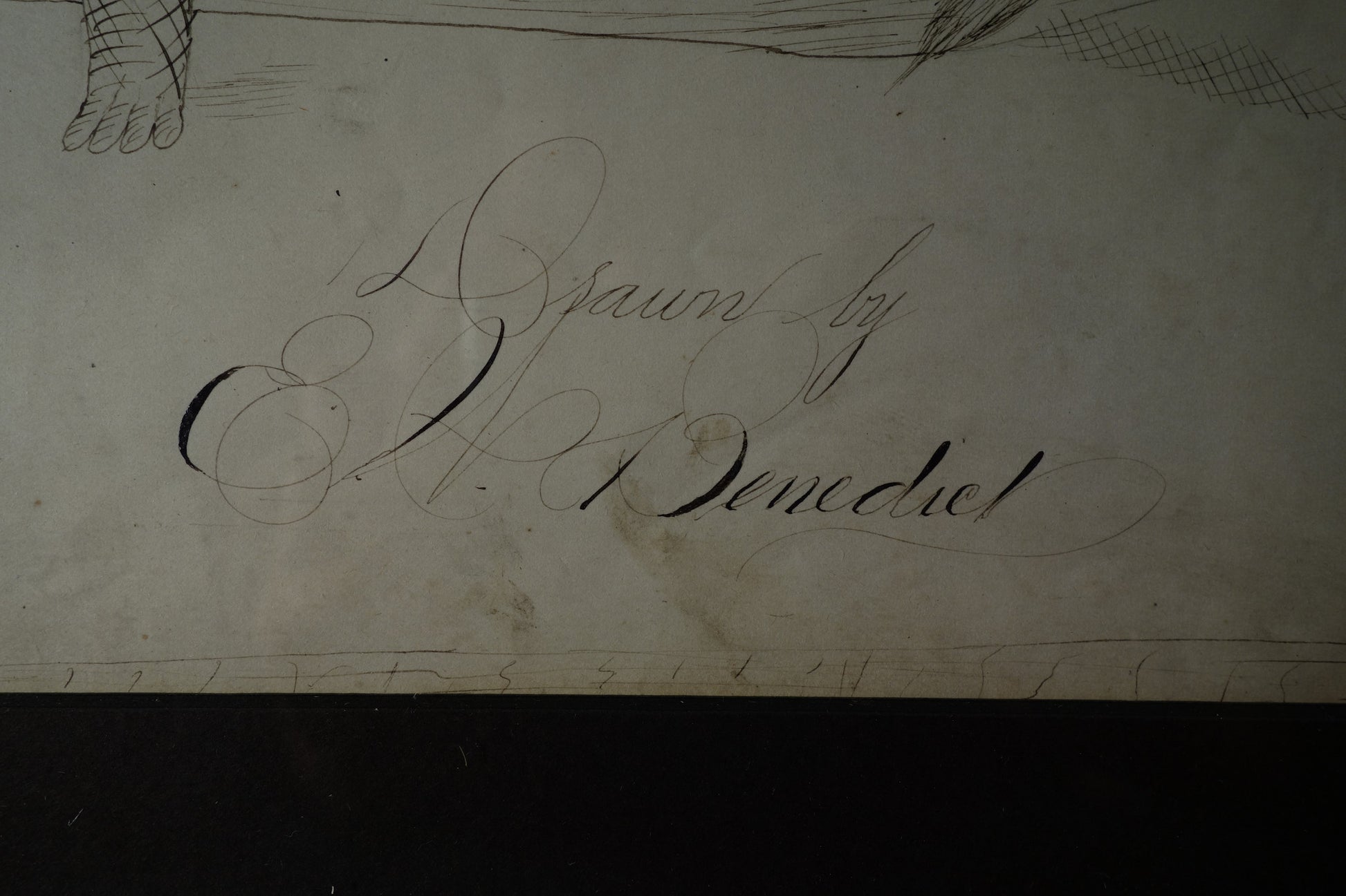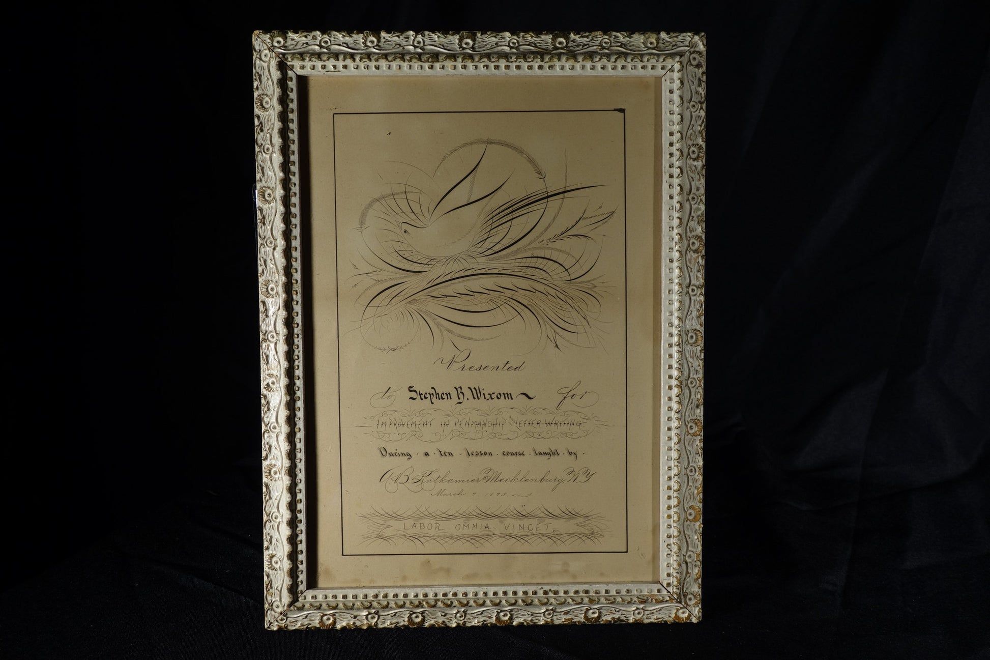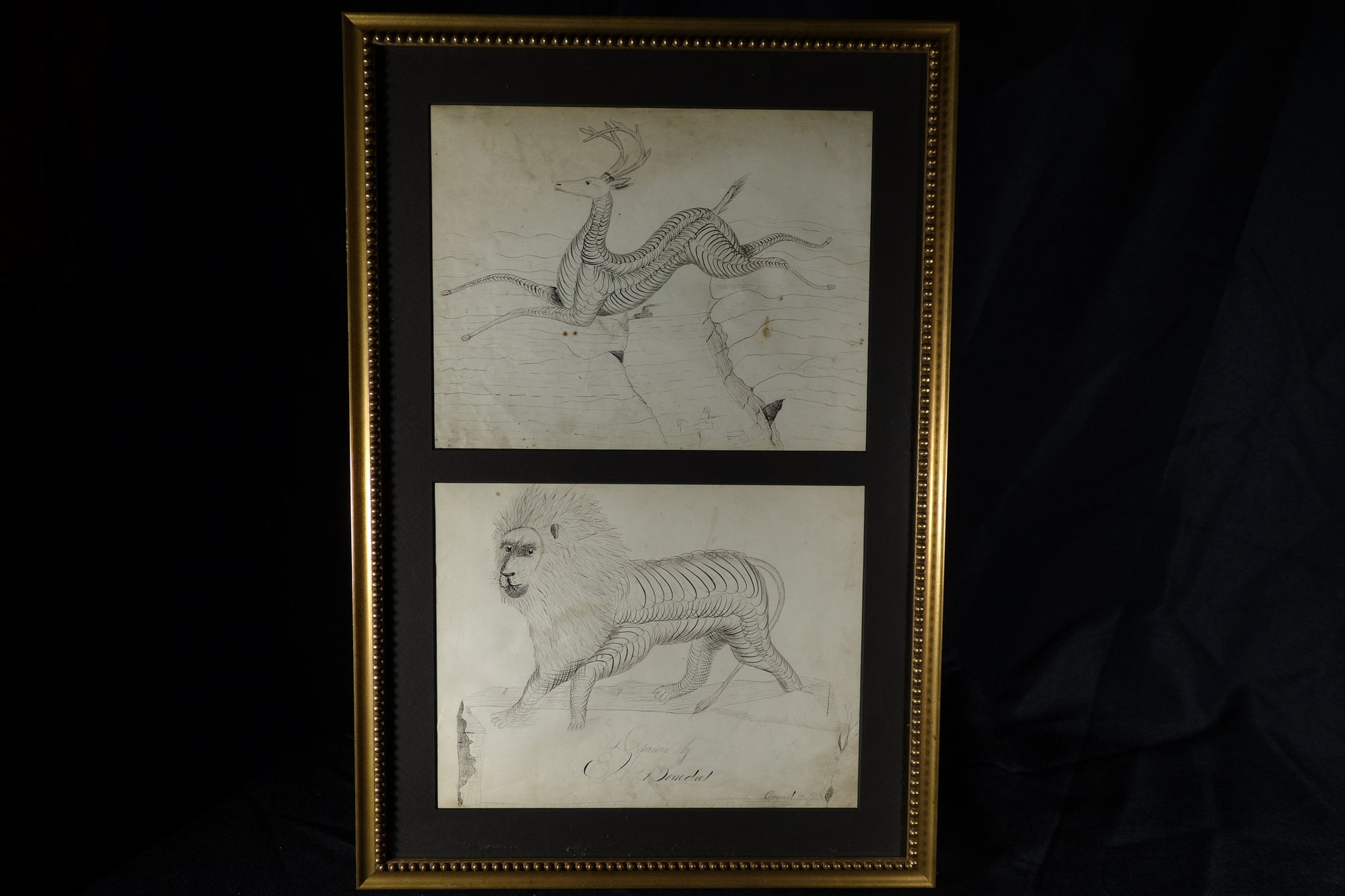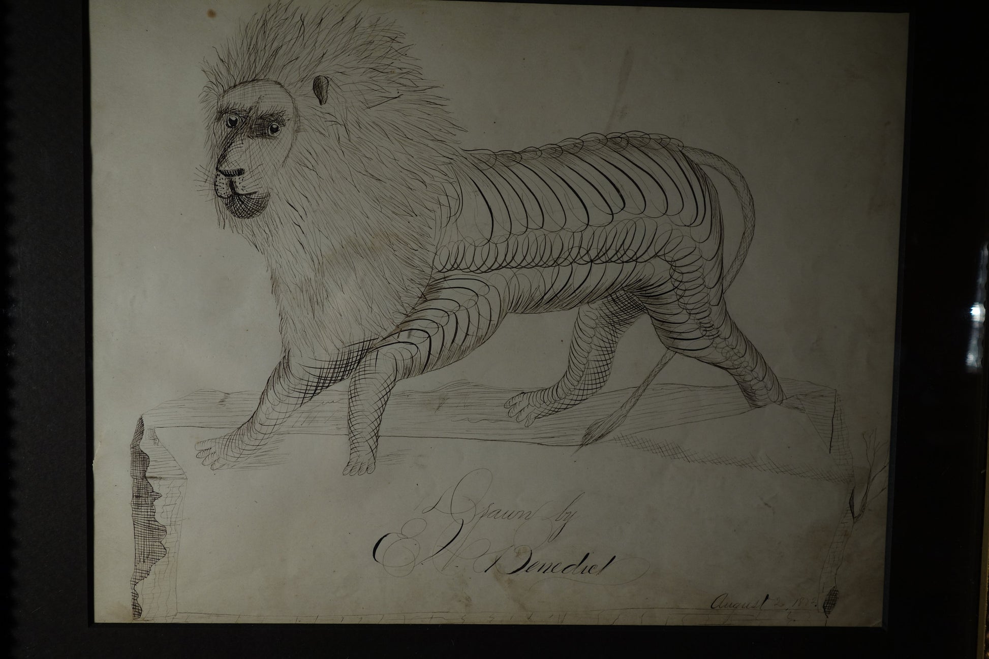 Here is a wonderful framed pair of Spencerian calligraphies. The top drawing features a stag leaping over a ravine with a tiny steamboat in the background. The bottom drawing features a lion atop a rock. The stag is unsigned, but both drawings are clearly done by the same hand. The lion is signed "Drawn by E. W. Benedict" and dated August 2 1882.