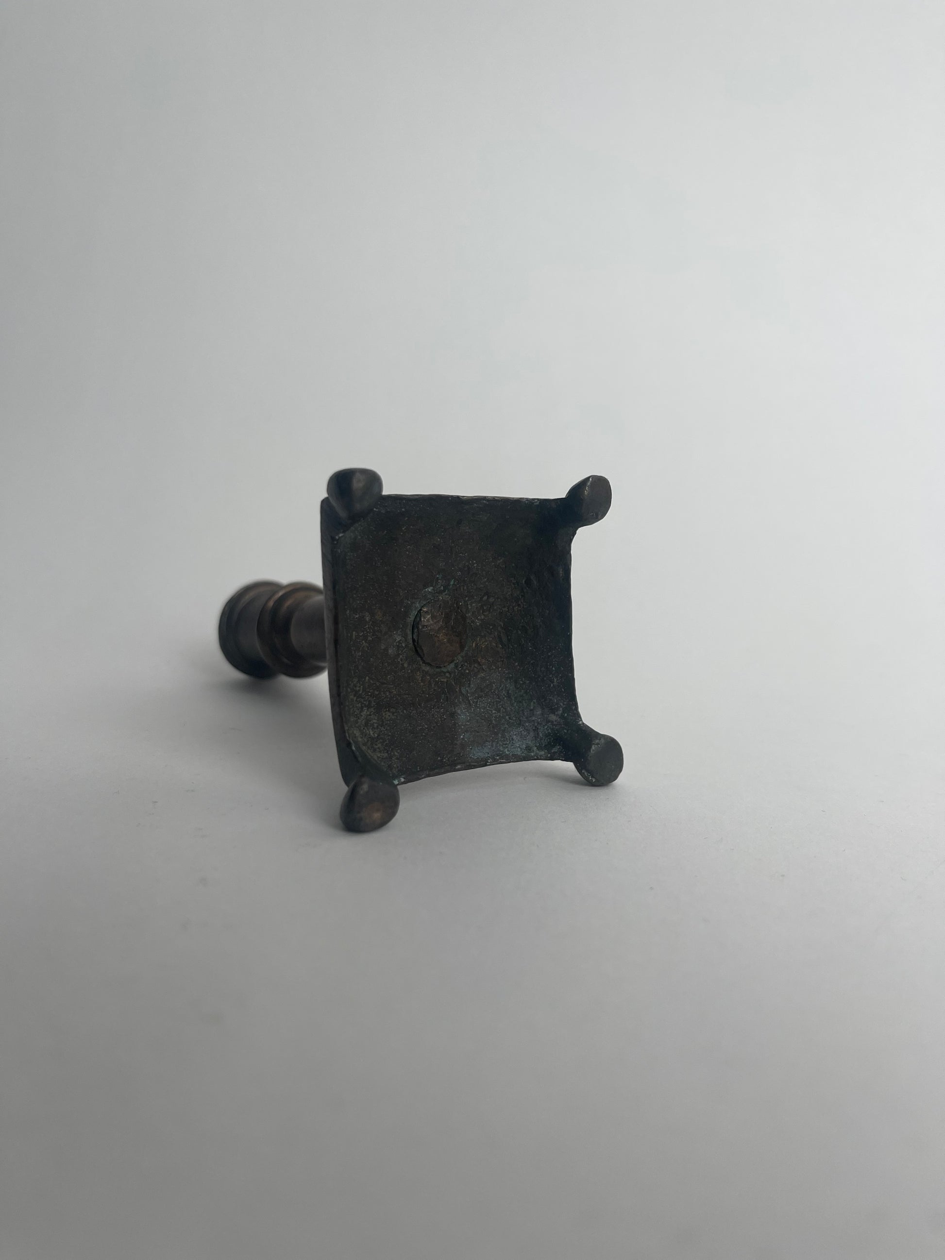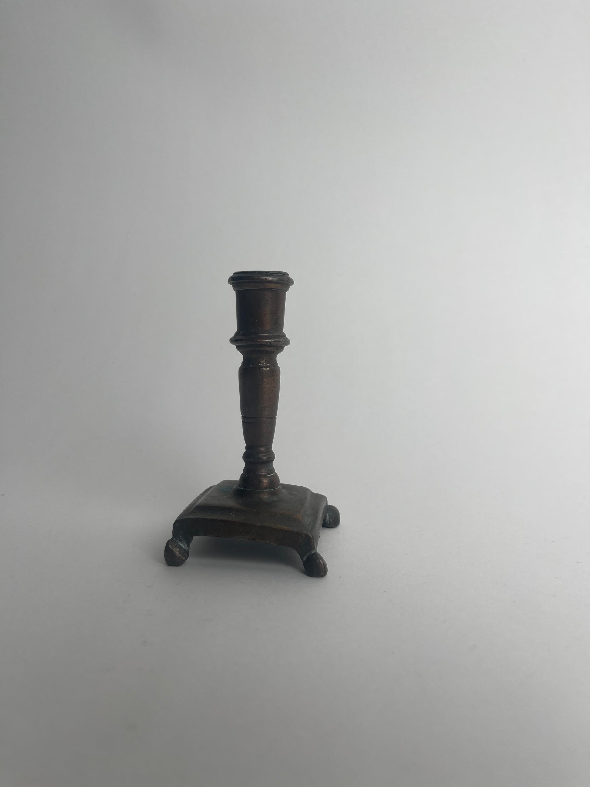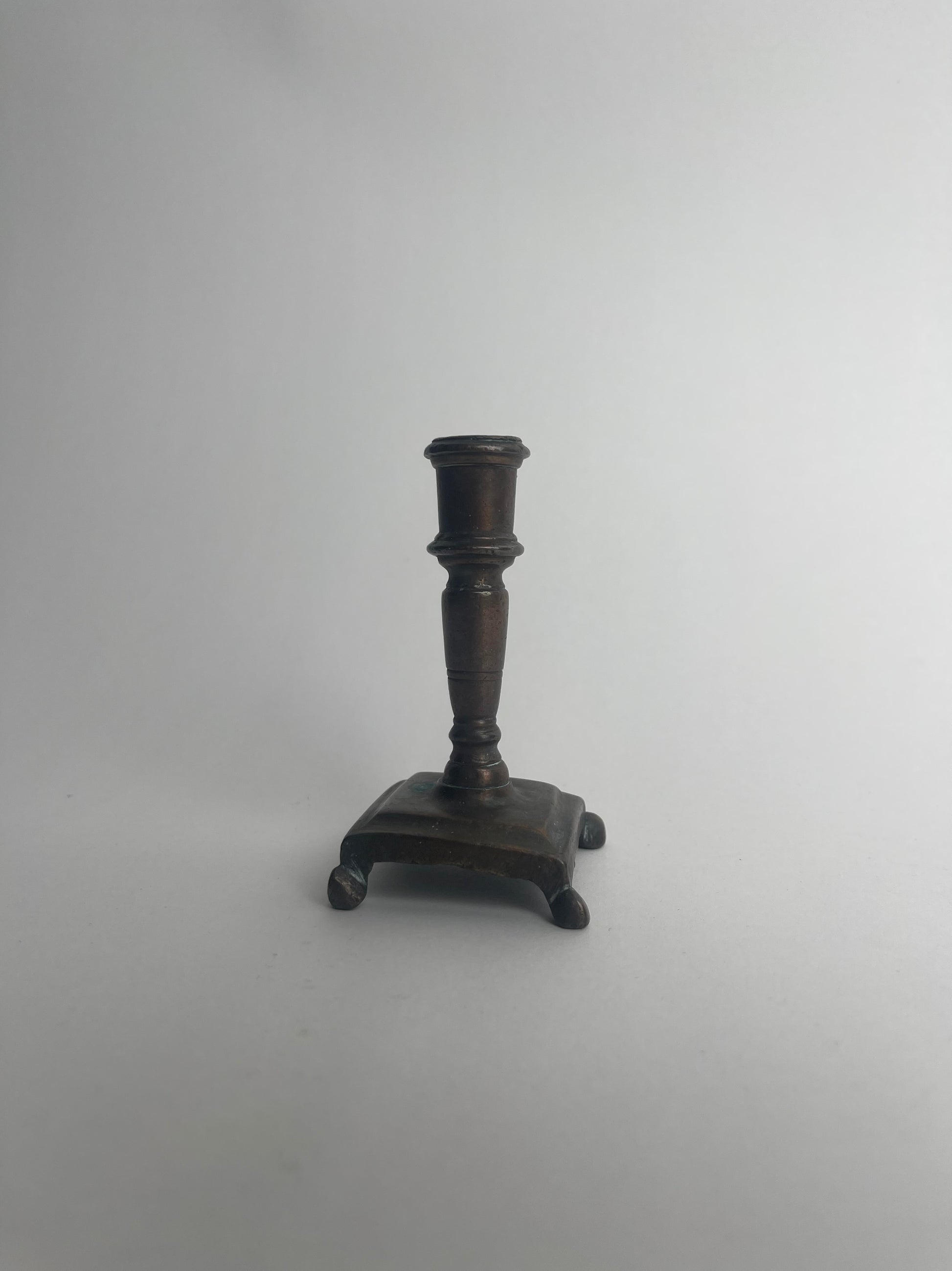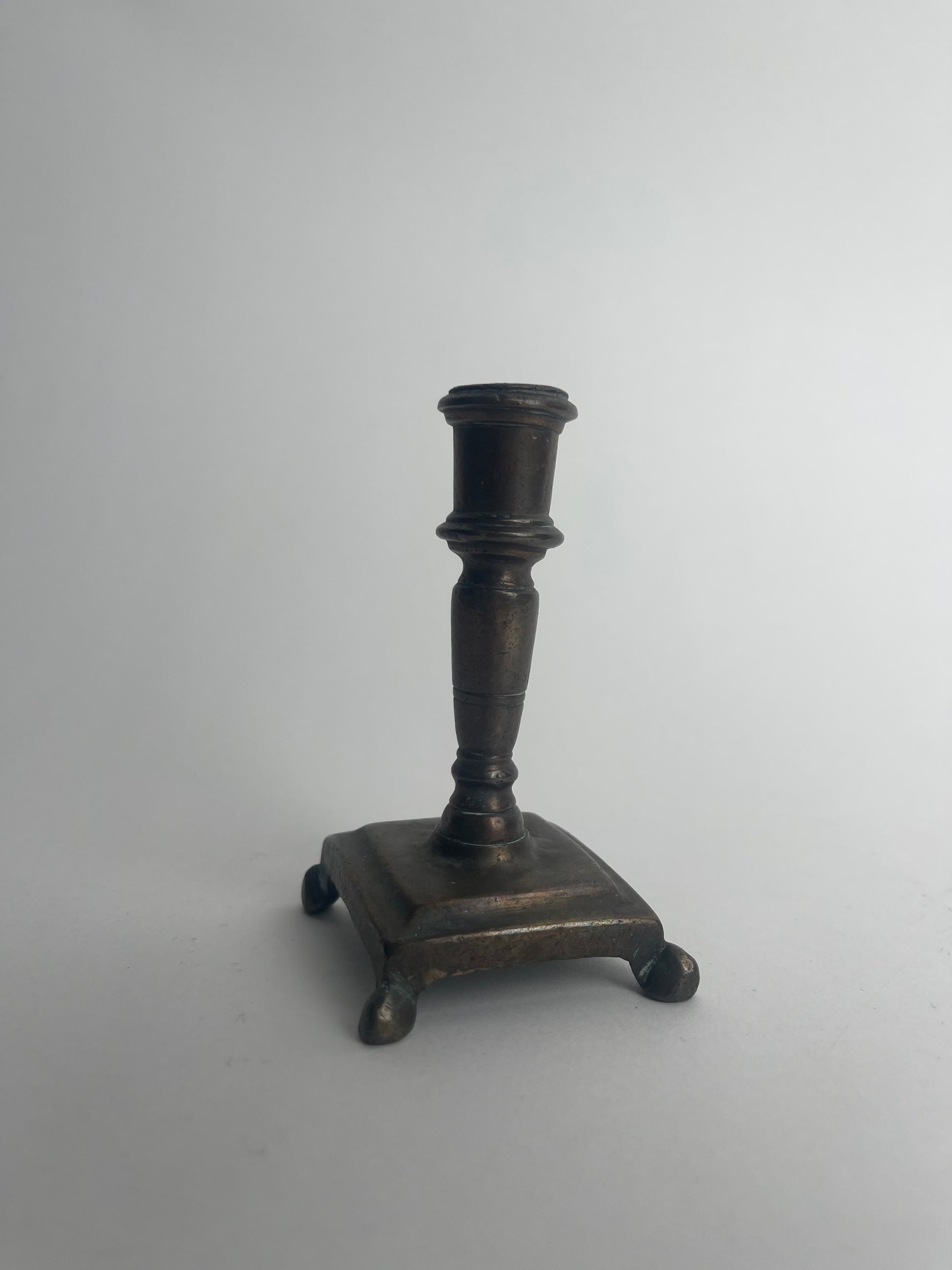 This rare 18th century footed taperstick exemplifies the refined craftsmanship of early European metalwork. Designed to hold slender tapers, it features a small cylindrical socket atop a gracefully turned stem. The stem rises from a square base supported by four small feet, which elevate the piece and provide stability.