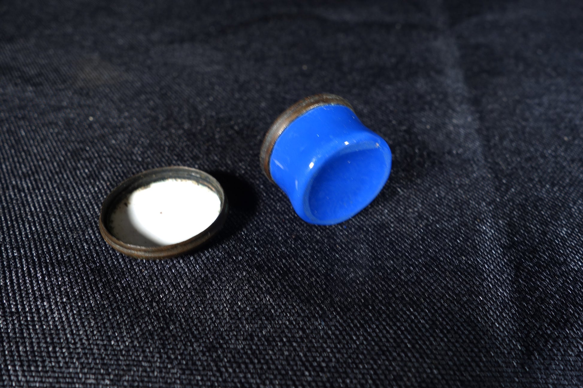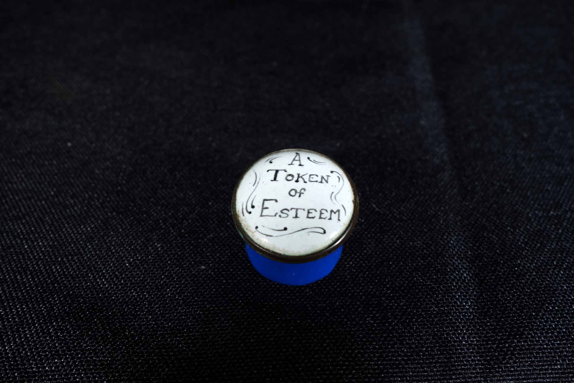 A wonderful Patch Box with a the motto "A Token of Esteem." This probably refers to a sweet treat that was originally in the box when it was purchased by a traveling sailor or merchant. The sailor would then give the box to his girlfriend or wife when he arrived home. The woman would then eat the treat and use the box for cream afterwards.