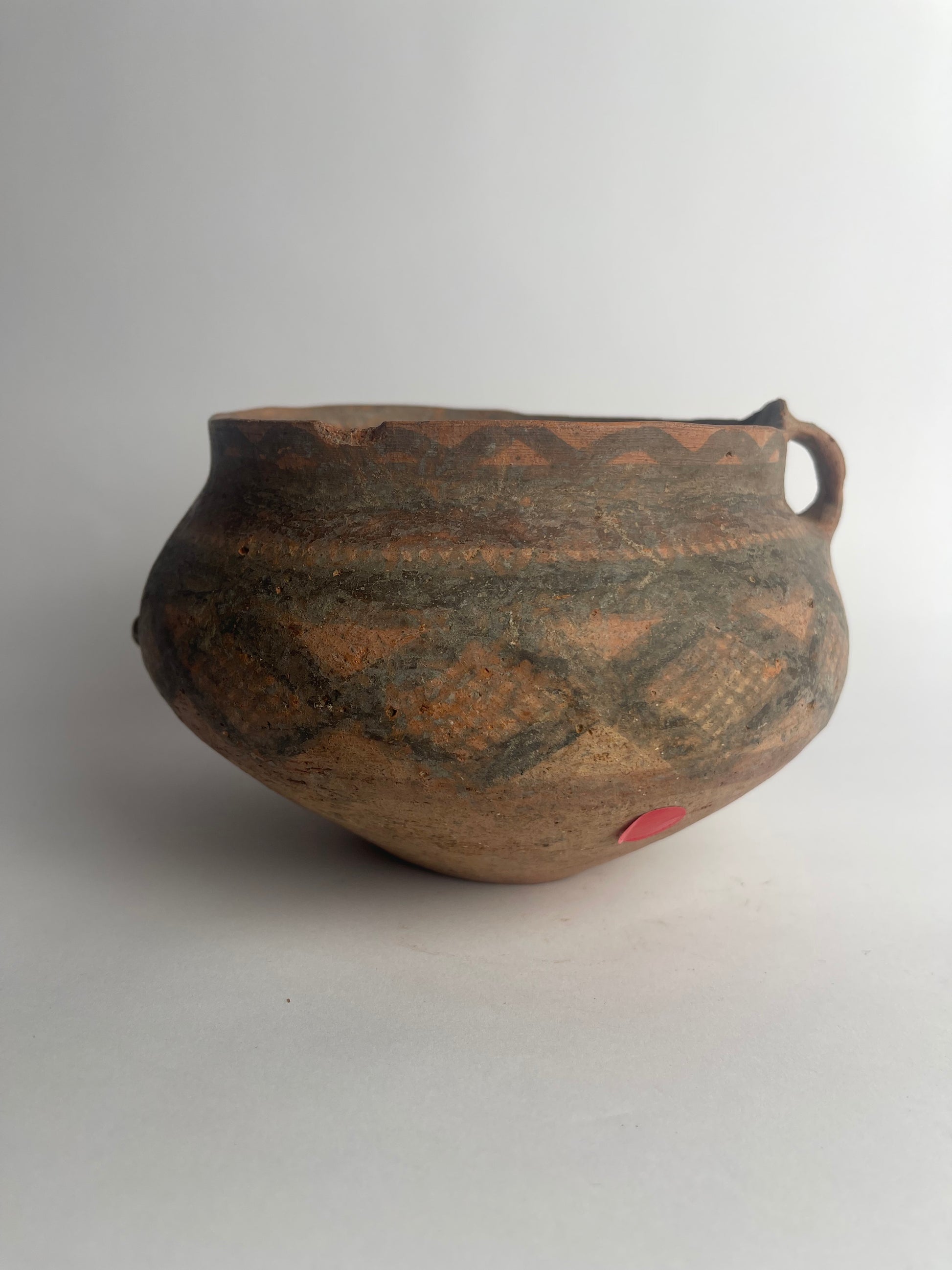 This Machang phase vessel, dating to approximately 2300–2000 BCE, is a refined example of Neolithic Majiayao culture pottery from the upper Yellow River region in northwestern China. Part of the final phase of the Majiayao tradition, Machang ceramics are known for their more standardized forms and increasingly complex painted designs.