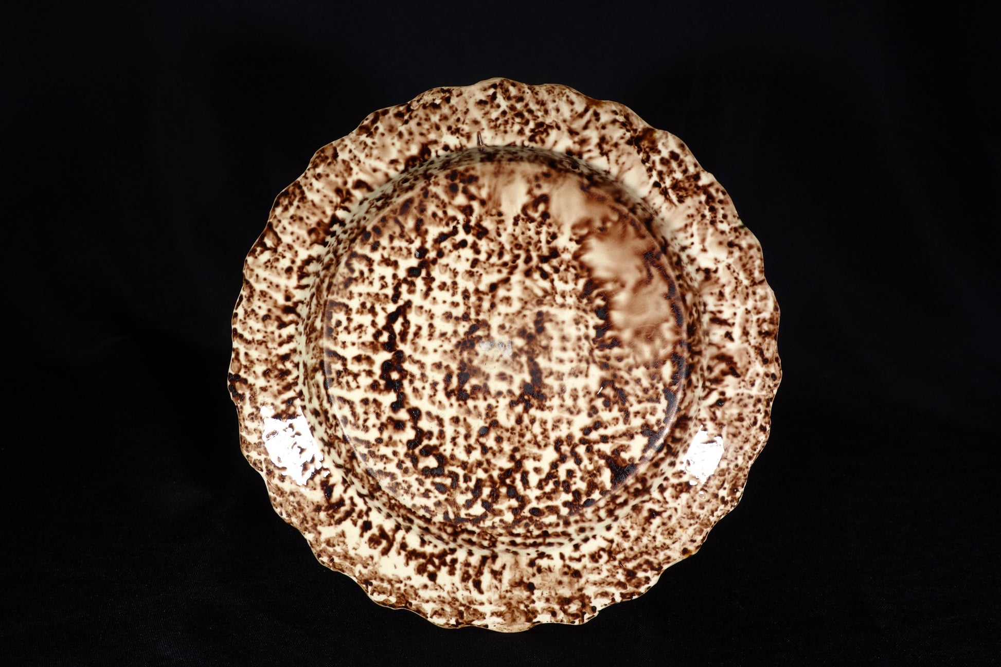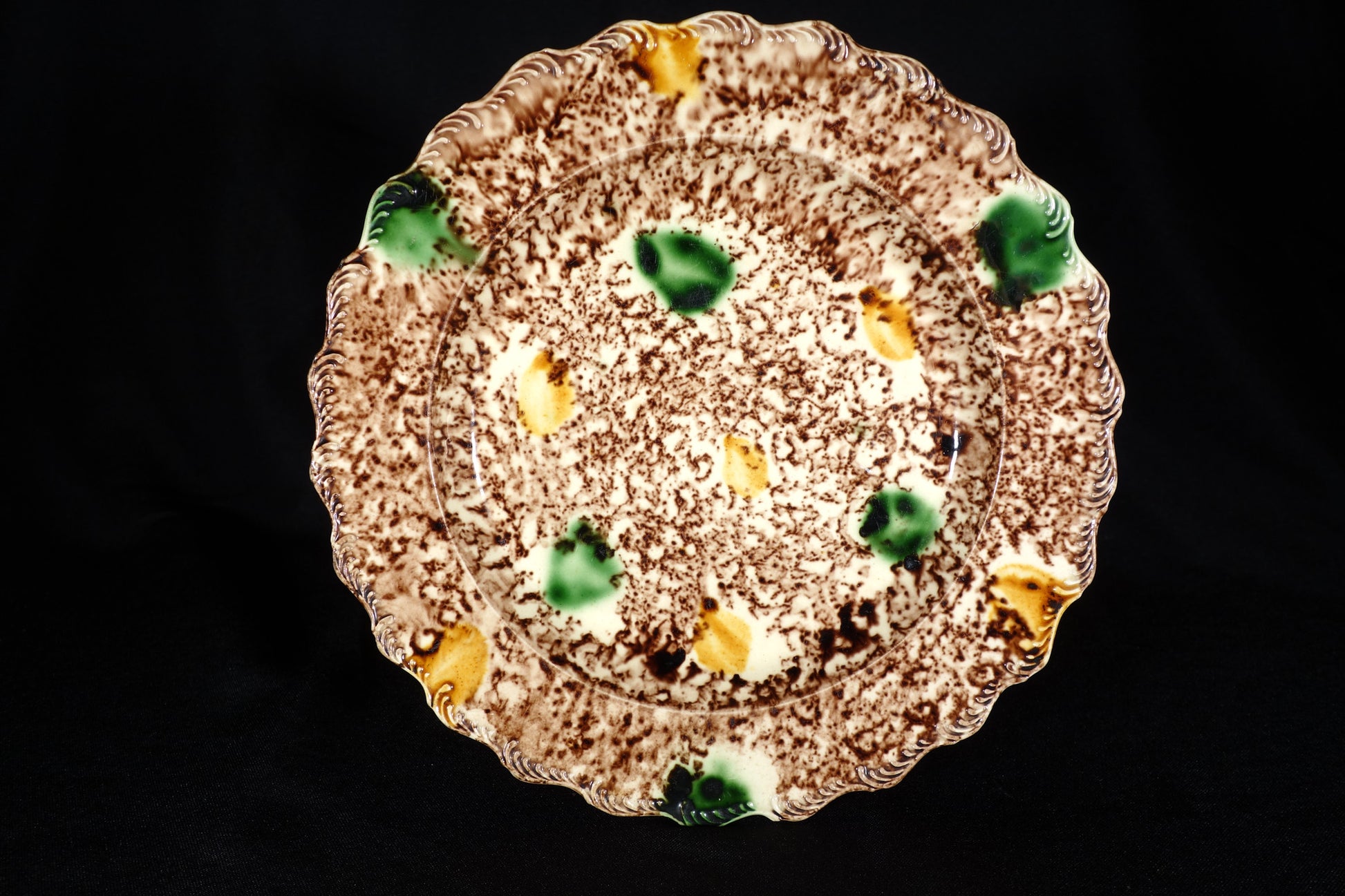 A beautiful whieldon type plate with a feathered edge and splashes of green and yellow over a brown lead glaze.