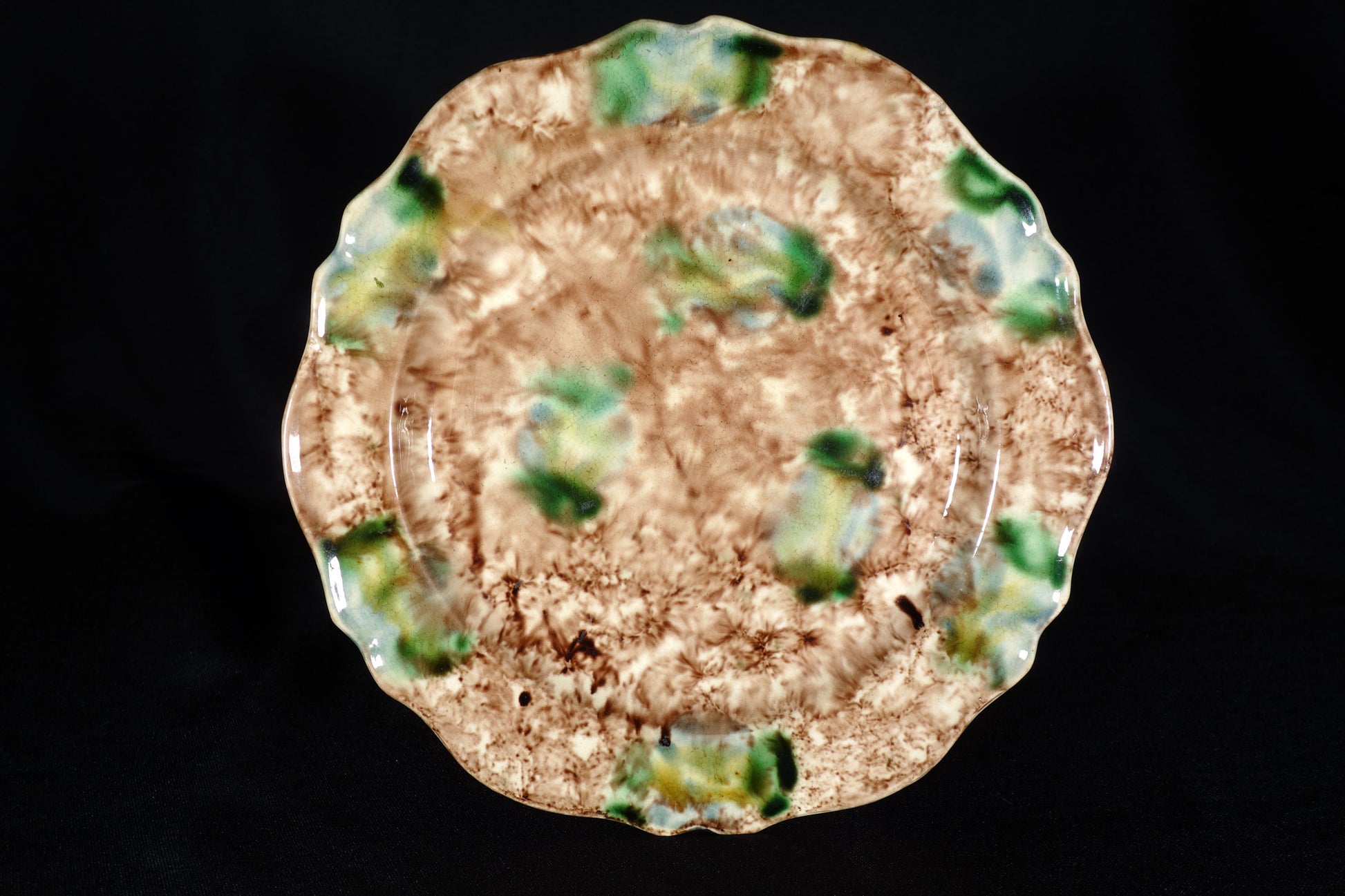 A remarkable whieldon type plate with a brown lead glaze with splashes of green.