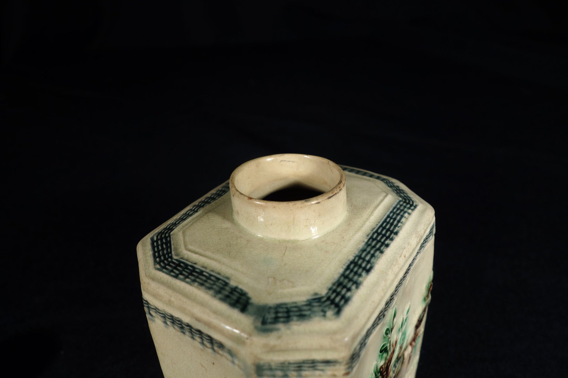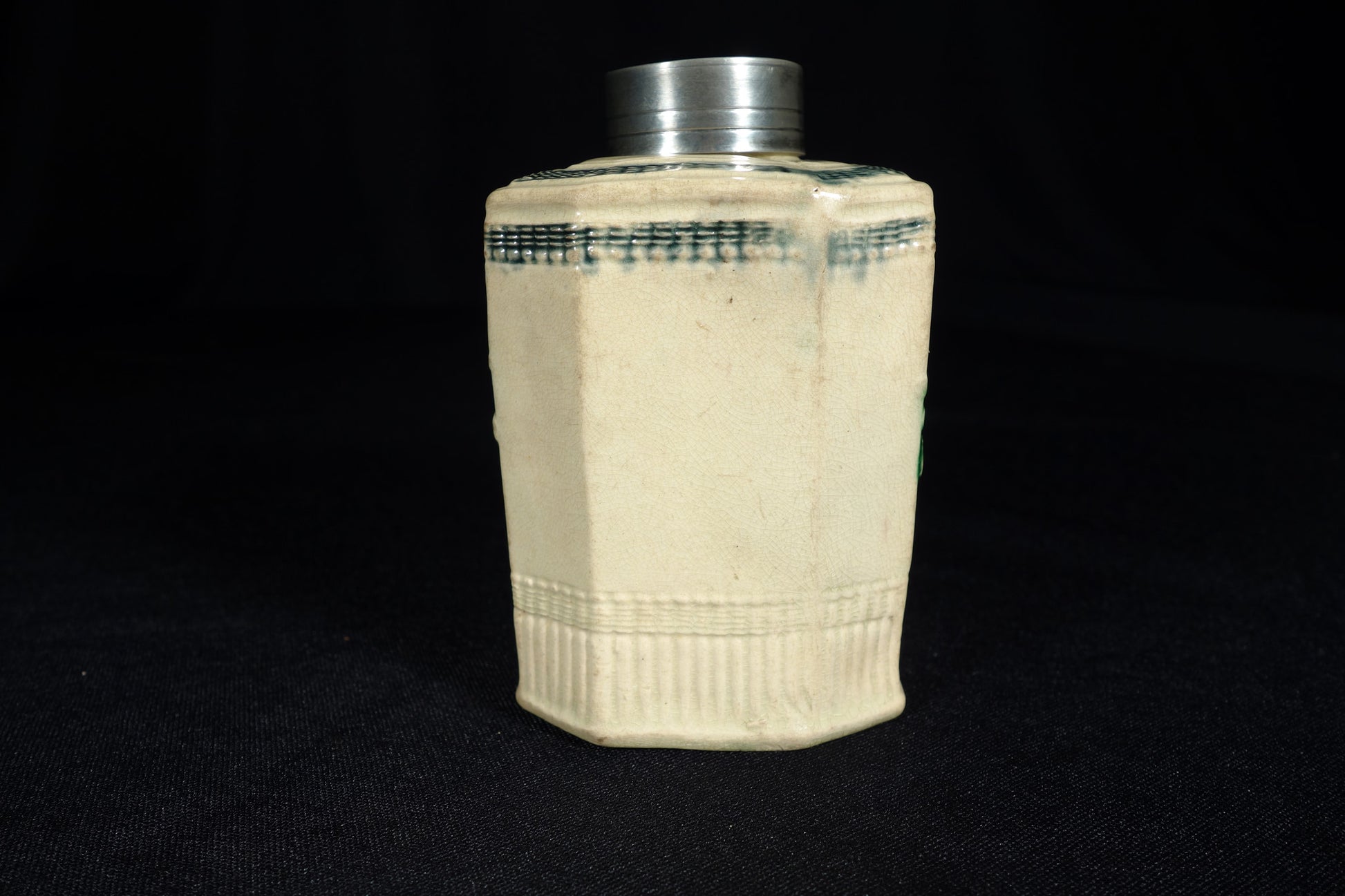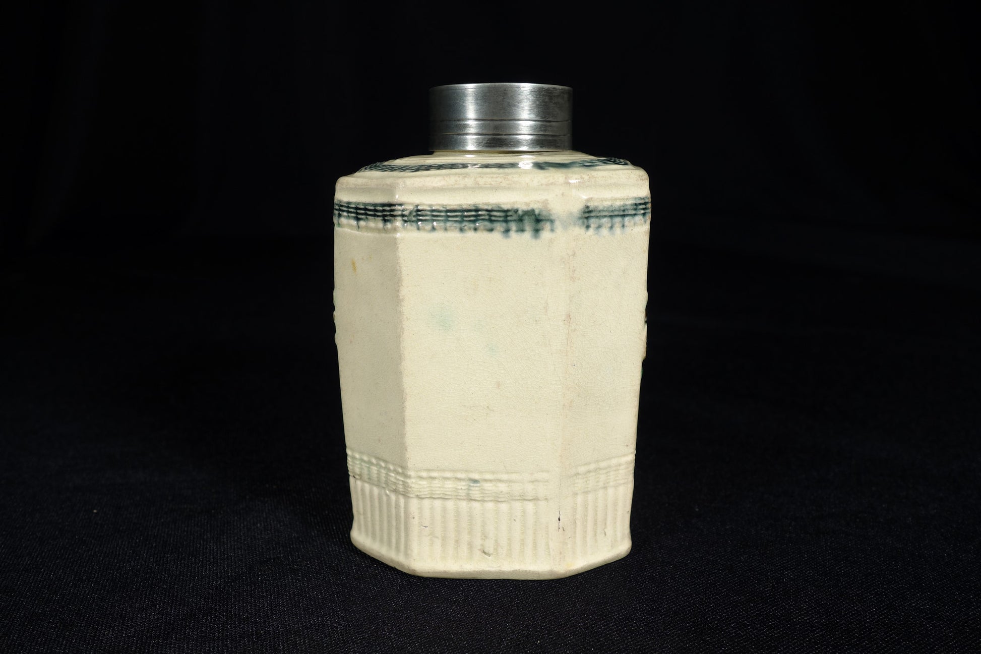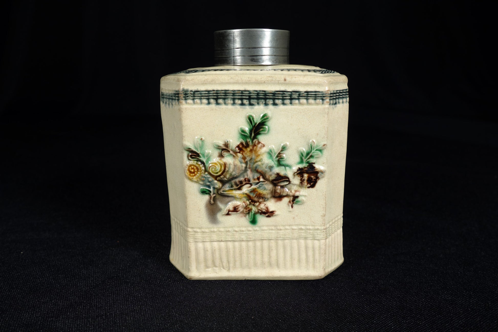 This creamware shell pattern tea caddy was made by William Greatbatch in Staffordshire around 1770. It features an arrangement of shells decorated in green, yellow, grey, and brown enamels.
